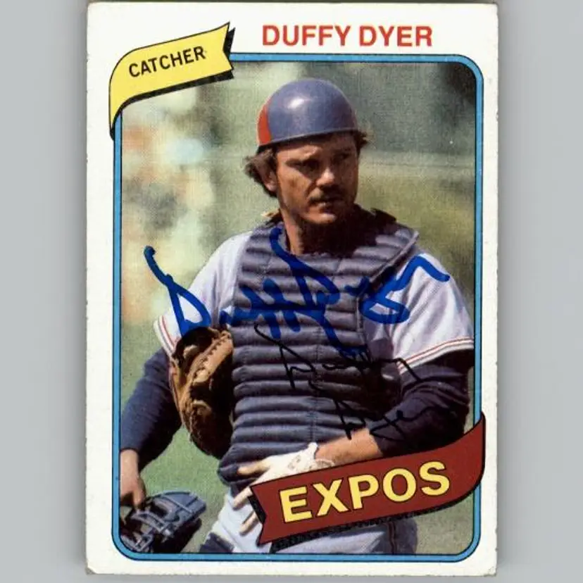 Authentic 1980 Topps baseball card featuring Duffy Dyer of the Montreal Expos, signed boldly in blue Sharpie. A must-have for Expos fans and collectors of autographed sports memorabilia. Your purchase supports Signatures For Soldiers in aiding homeless and disabled veterans.