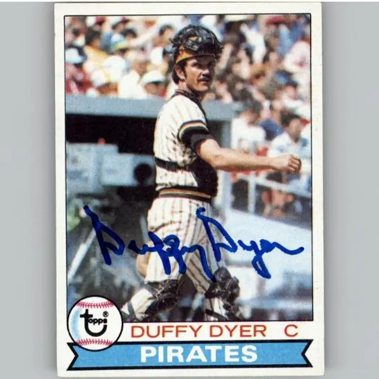 Authentic 1979 Topps baseball card featuring Duffy Dyer of the Pittsburgh Pirates, signed boldly in blue Sharpie. A must-have for Pirates fans and autograph collectors. Your purchase supports Signatures For Soldiers in aiding homeless and disabled veterans.
