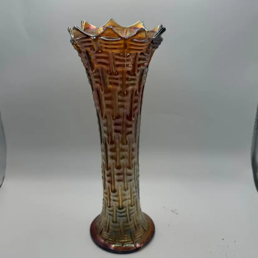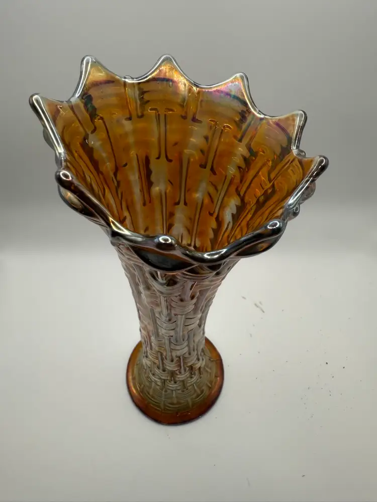 Carnival glass, also known as iridescent glass, was produced from the early 1900s to the 1930s, with Dugan Glass Company being one of its most prolific manufacturers. This type of glass was made by applying a metallic salt solution to the surface of molten glass, which then created a shimmering, iridescent effect when fired. It was often given away as prizes at carnivals and fairs, hence its name, and was popular for its affordability and decorative appeal.
