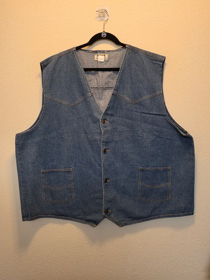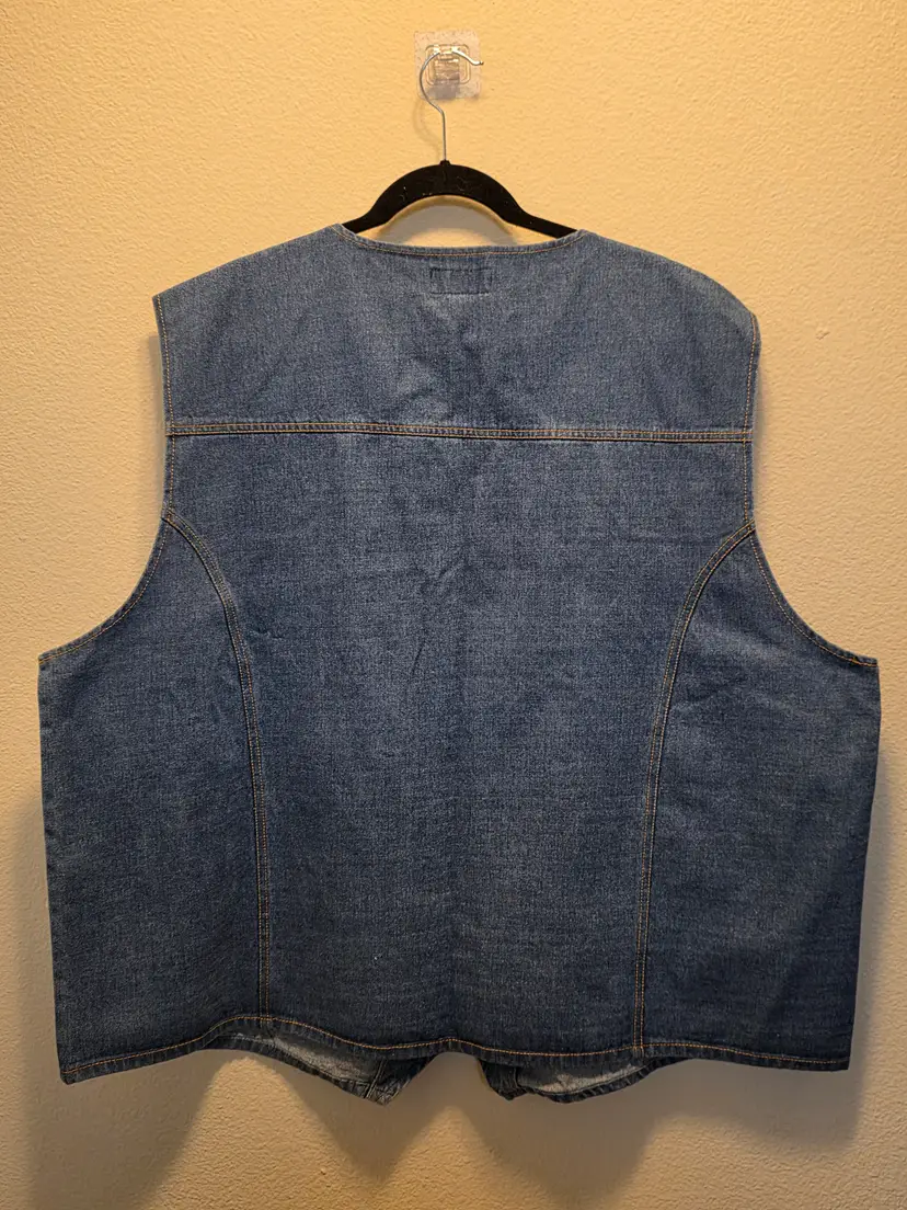The Duke Haband Men's Blue Jean Vest in size 3X is a stylish and versatile addition to any casual wardrobe. Made from comfortable cotton denim, this vest features a button closure and practical pockets. Ideal for all seasons, this vest is perfect for adding a touch of style to any outfit. The blue color and classic design make it a timeless choice for men looking to elevate their look with a quality piece from a trusted brand.