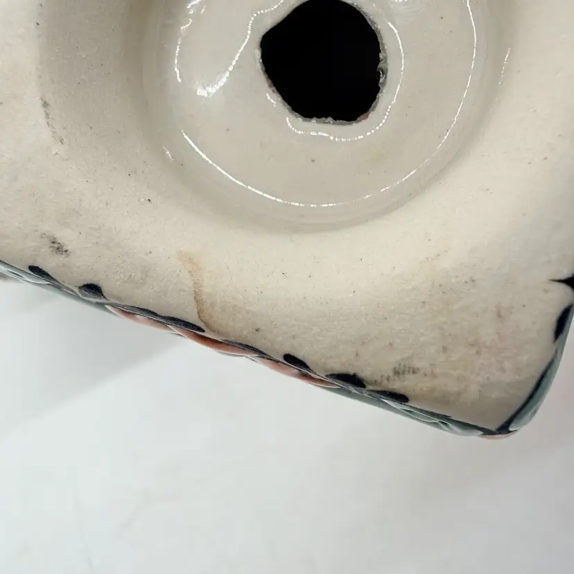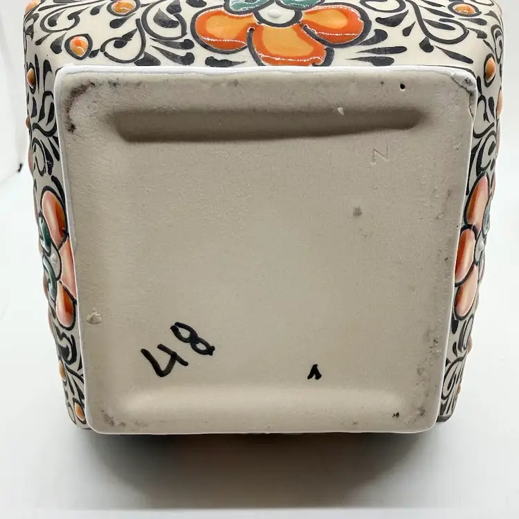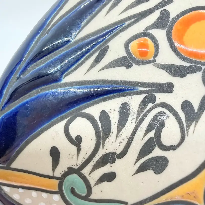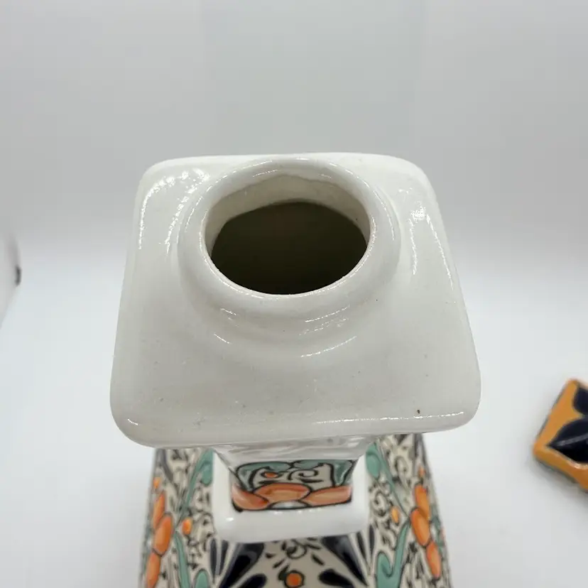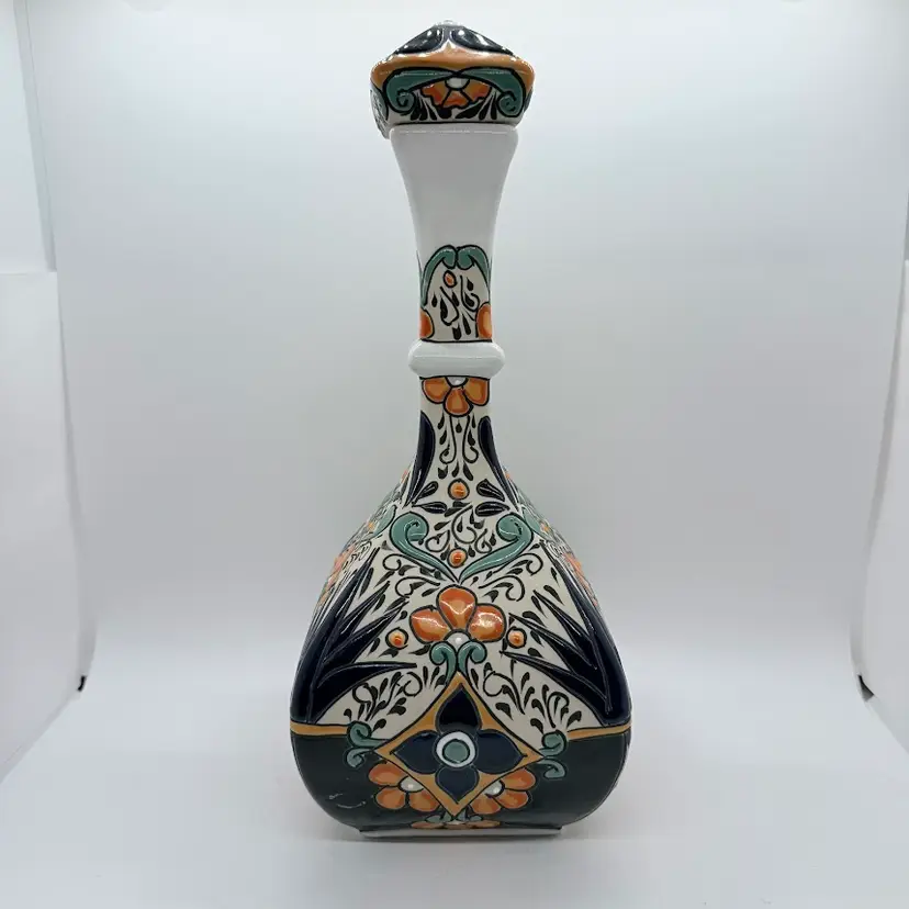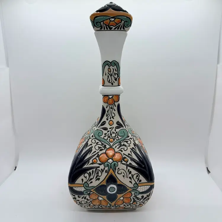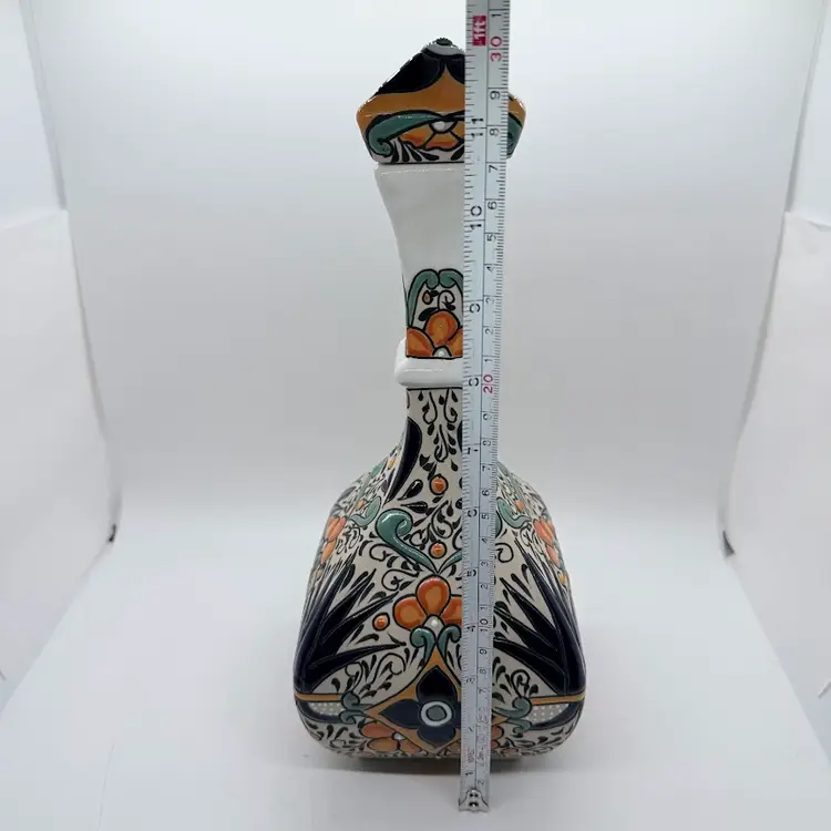Dulce Amargura Tequila Empty Talavera Style Ceramic Pottery Liquor Bottle/ Decanter. Made in Mexico. No chips or cracks. Signs of wear and use. The cork part of the stopper is missing and the Dulce Amargura label is missing. Production defects such as smudging to the design and a small defect on the base. Please see all pictures. Sold as is.