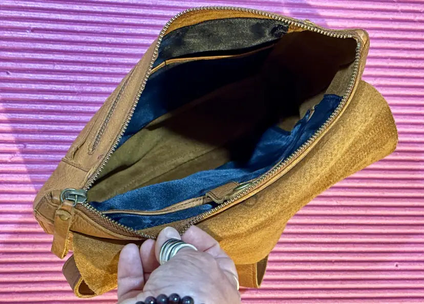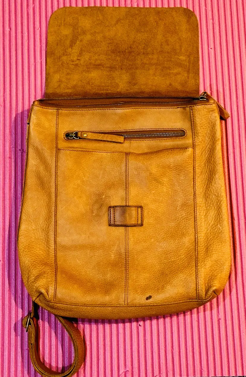 Leather convertible tote pack in cognac. Flap closure with zip inside for security.