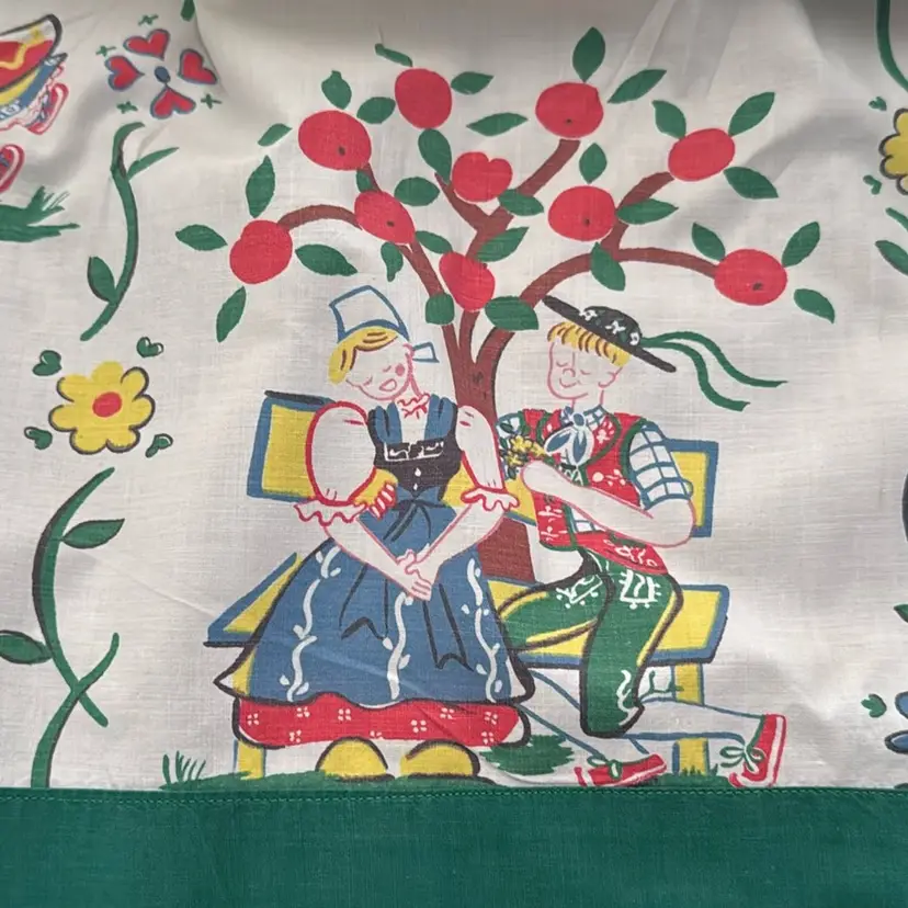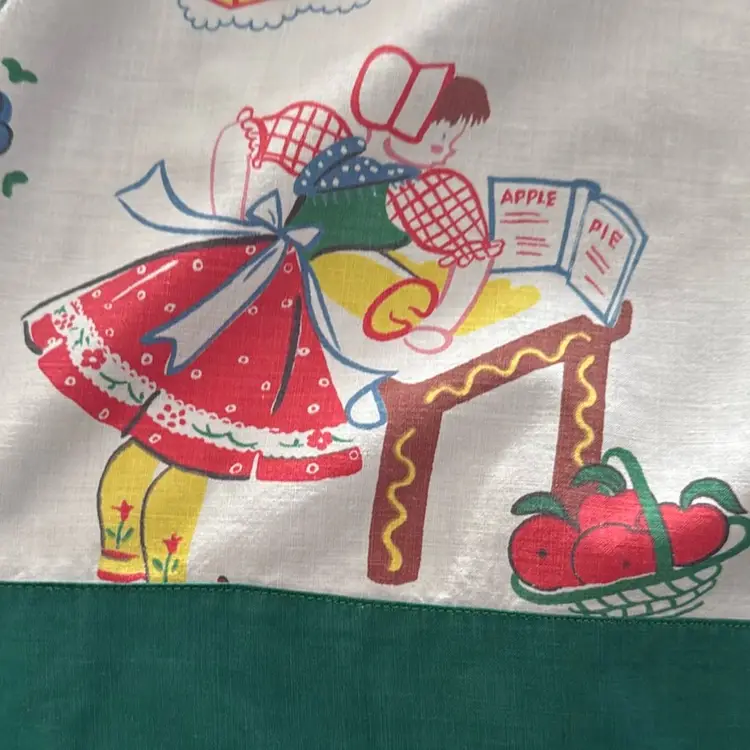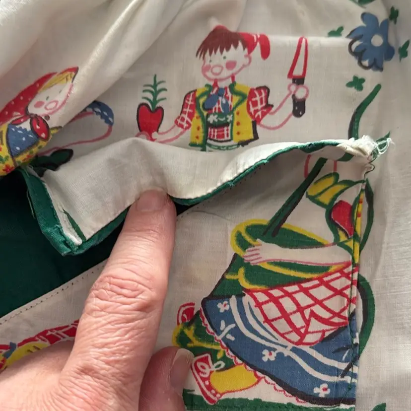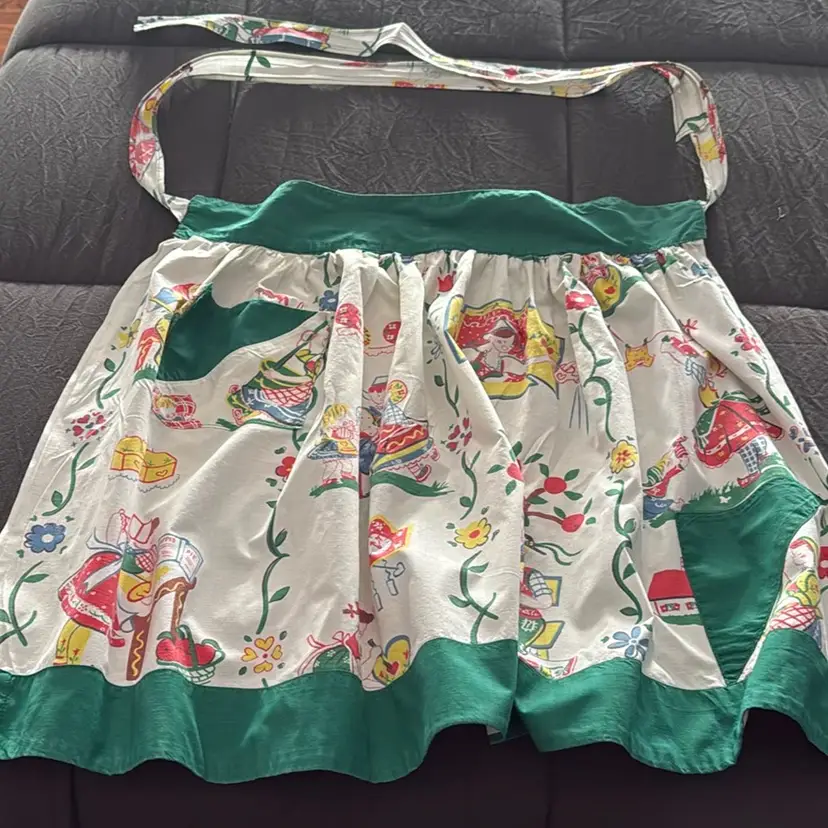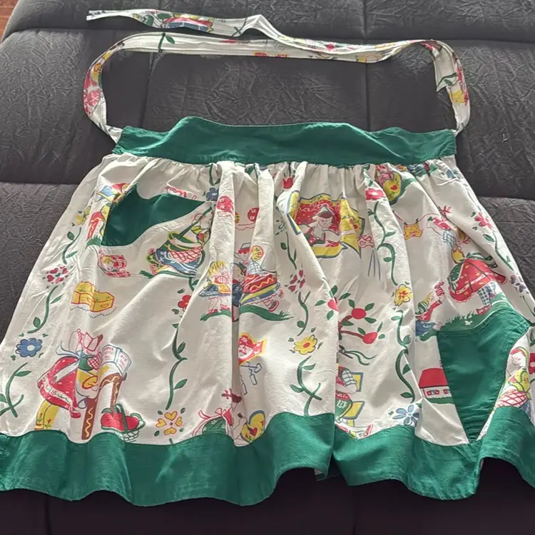 20” long and front waist panel is 17” pocket needs a few stitches recently laundered and (badly) pressed by me