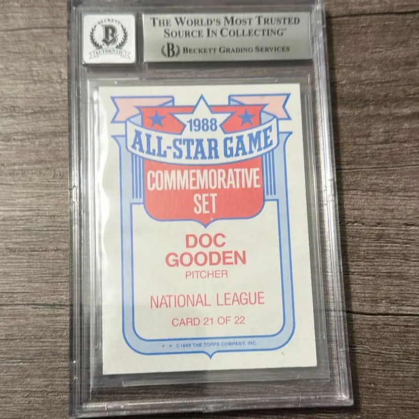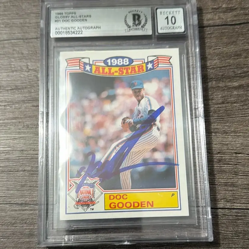 This is a 1988 Topps All-Star Game #21 Dwight "Doc" Gooden autographed baseball card. The card features an authentic autograph by former New York Mets pitcher Dwight Gooden. It has been authenticated and graded by Beckett (BCCG) with an autograph grade of 10. Dwight Gooden was a four-time All-Star and helped the Mets win the 1986 World Series. He was inducted into the New York Mets Hall of Fame in 2010, and his number 16 jersey was retired by the Mets in 2024.