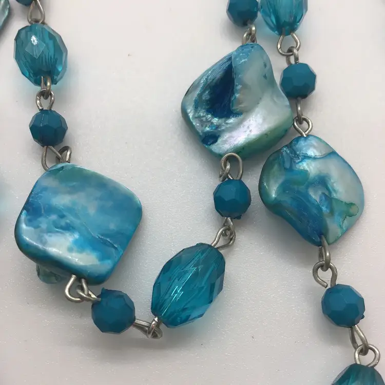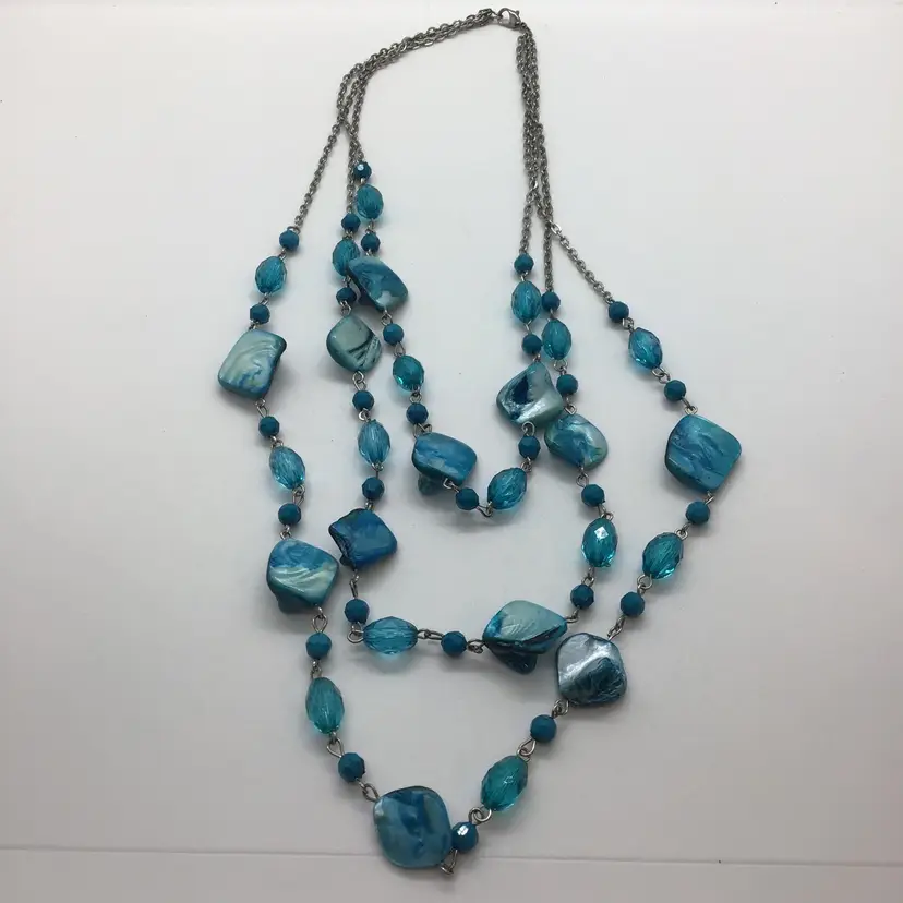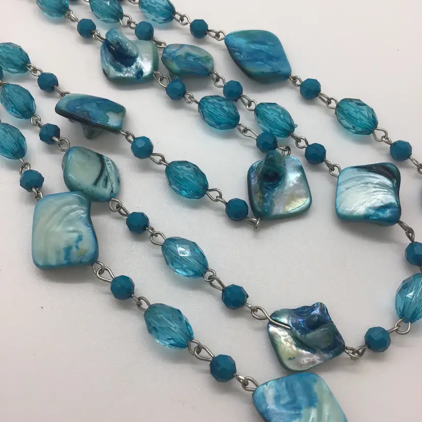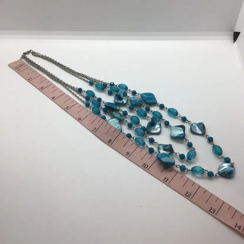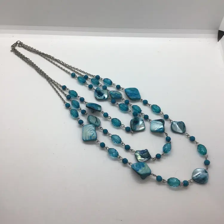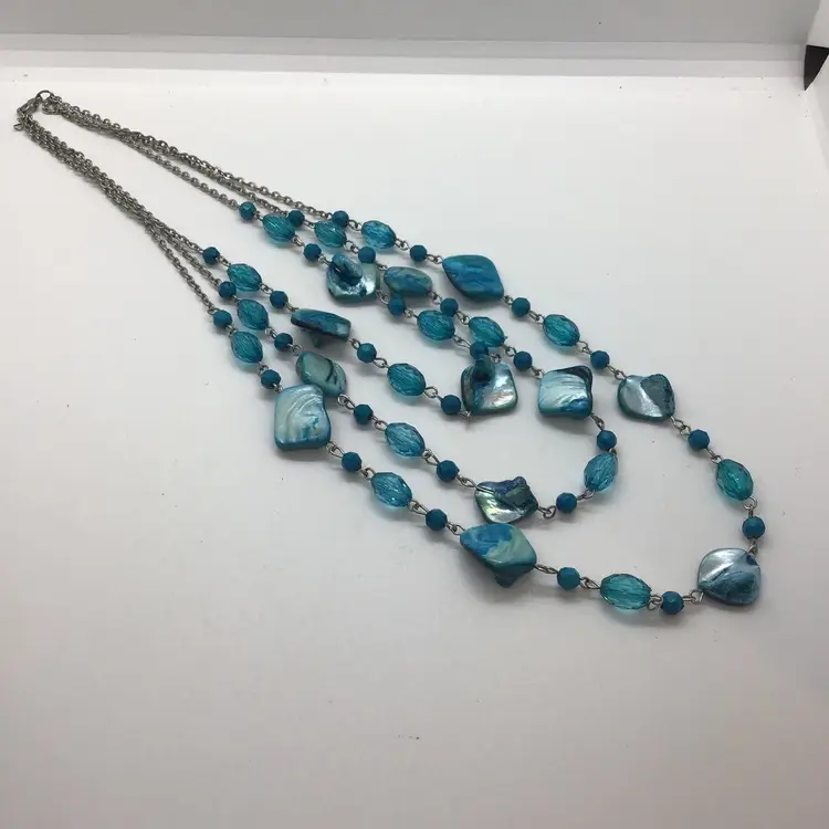 Dyed Abalone Shell Blue Three Layered Statement Boho Summer Beach Surf Necklace. This gorgeous color necklace is three separate strands. Turquoise color. Lobster claw type closure. Comes from a non smoking home.