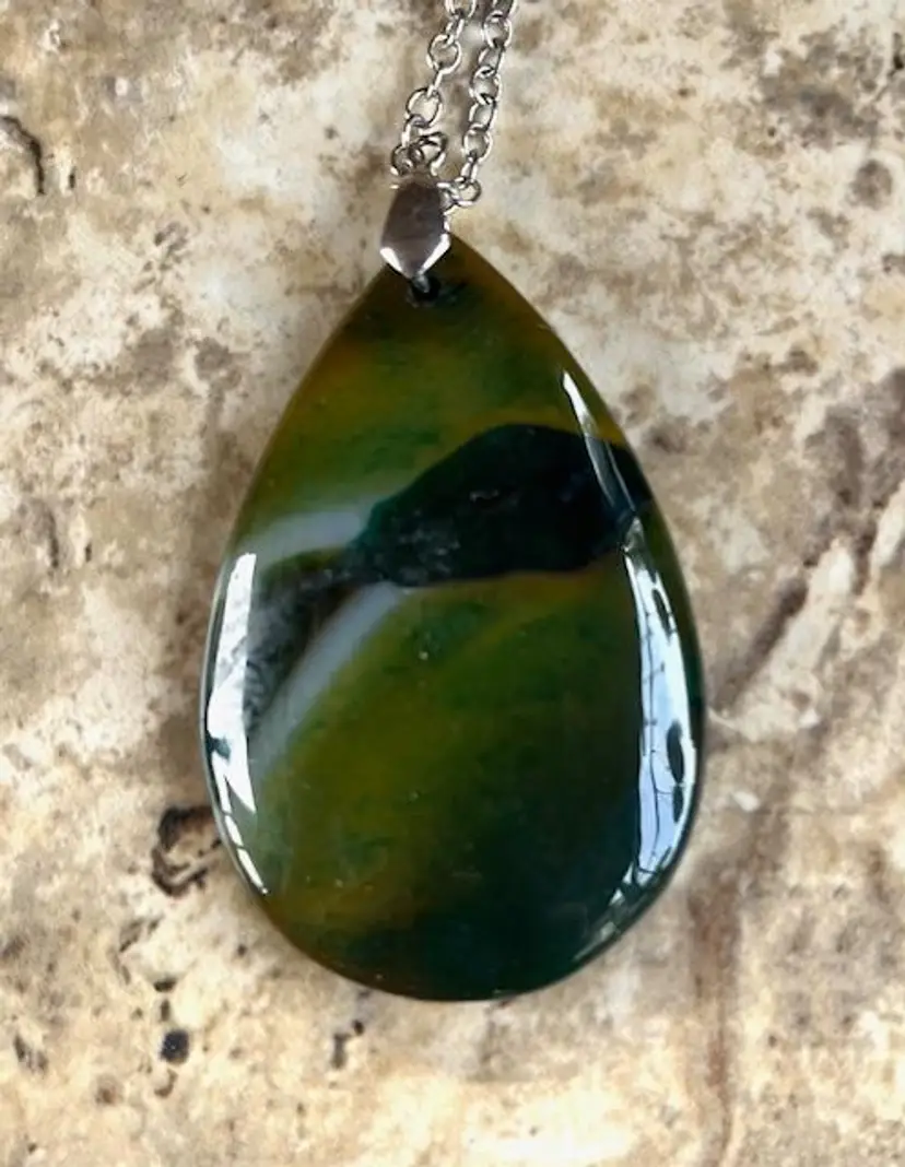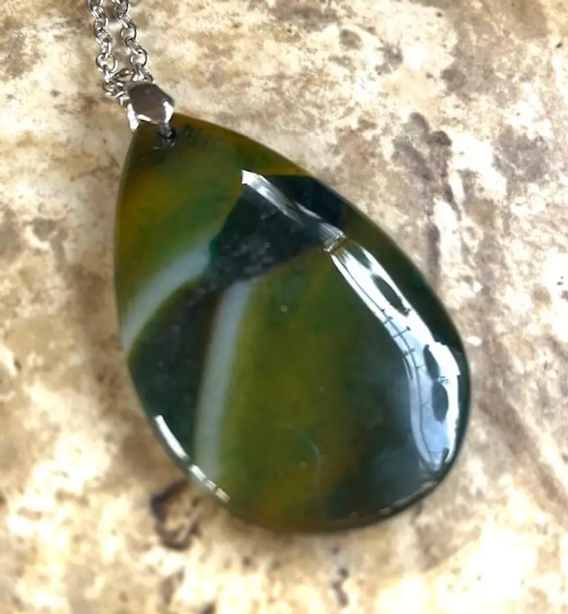It's hard to get a good picture of this beautiful pendant. It is dyed green agate in a pear shape.