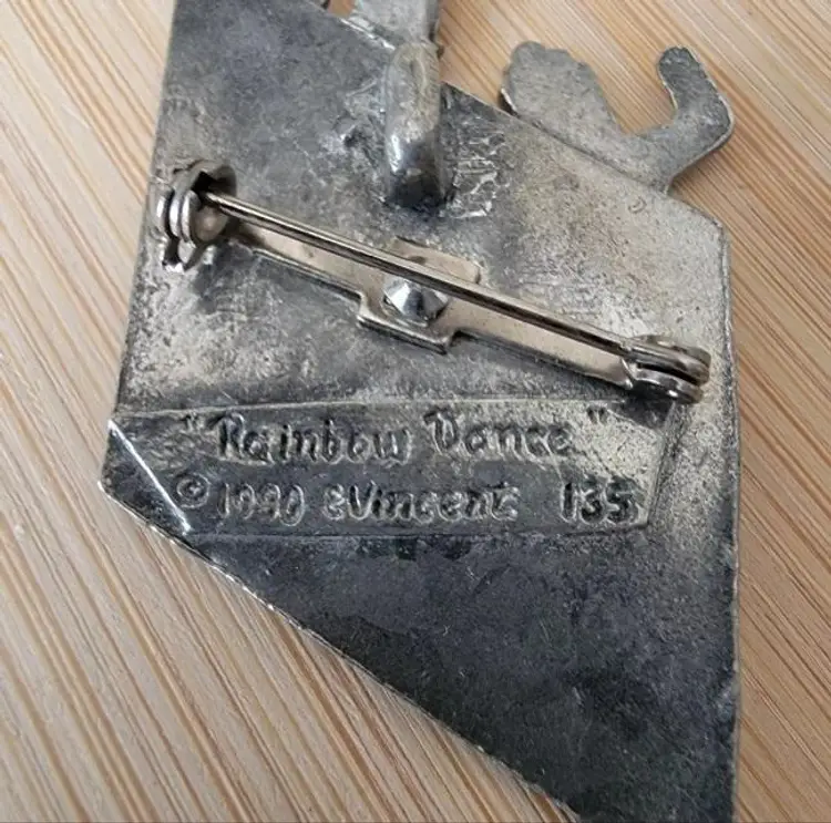 E Vincent Pewter "Rainbow Dance" Brooch 1990 Can be worn as a brooch or pendant Please review photos carefully prior to purchase Measurements are approximate