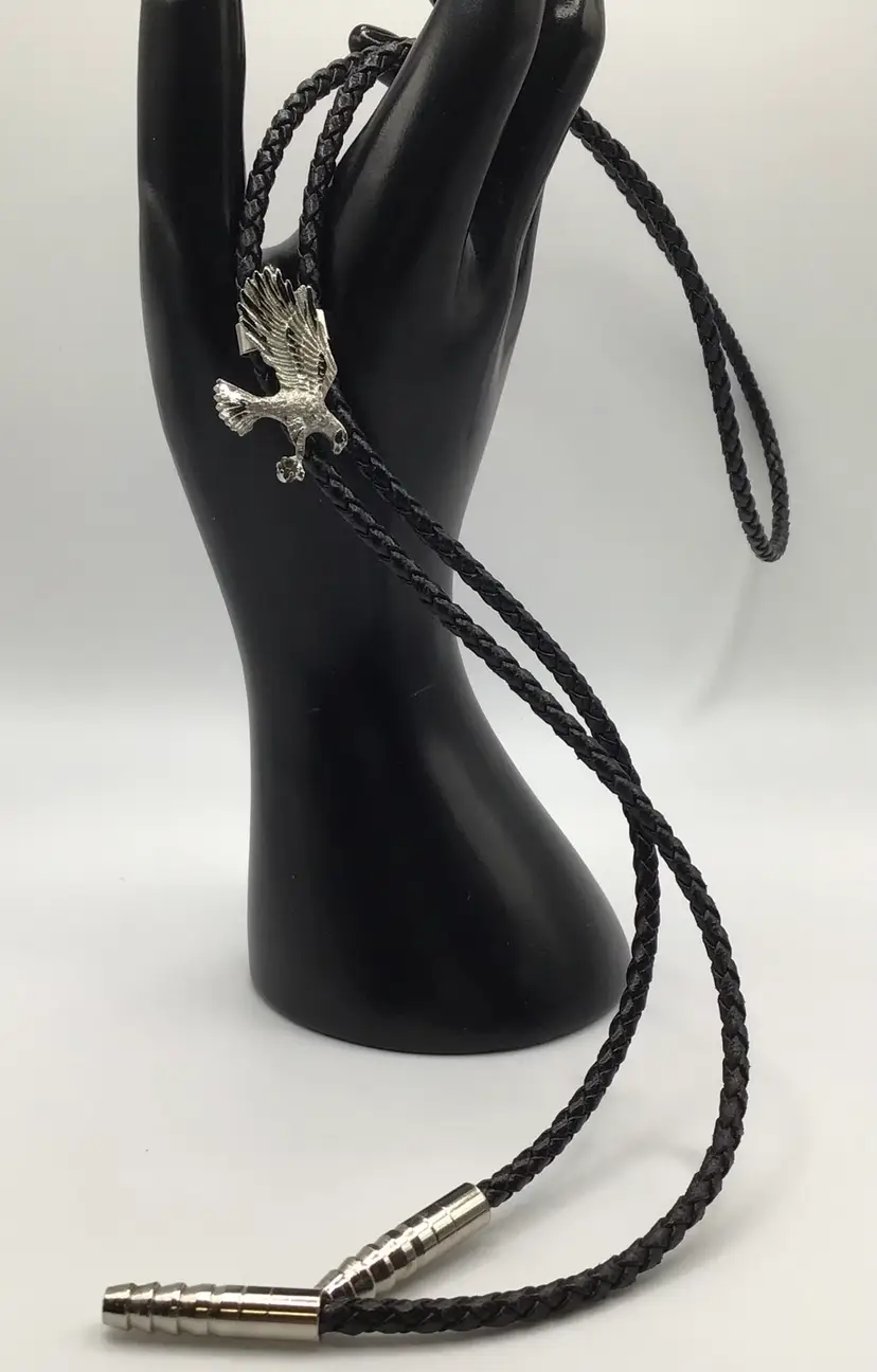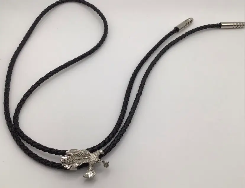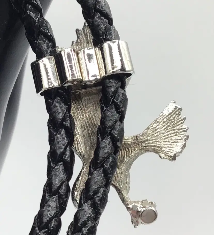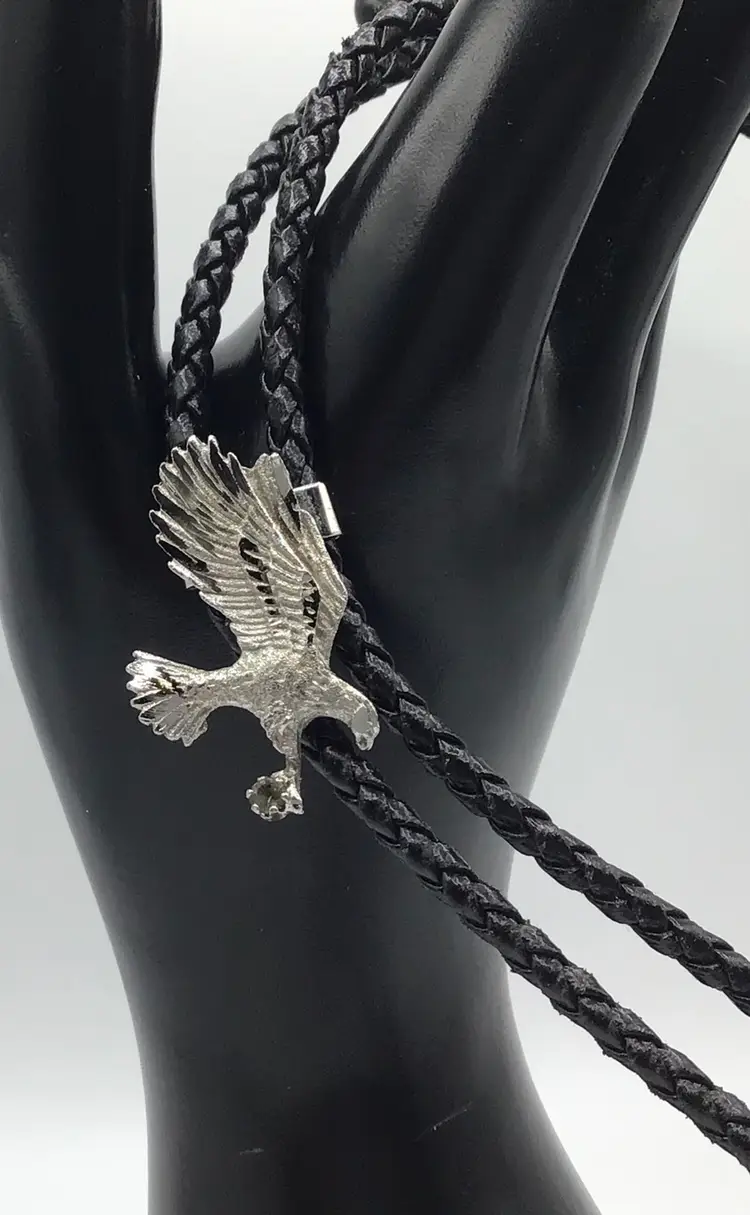 Sterling diamond cut bolo tie unsigned. Tested & confirmed 925. No marks. A small rhinestone in claws. The silver tone tips on cording are not sterling. Measures 1-1/4 inch. #012