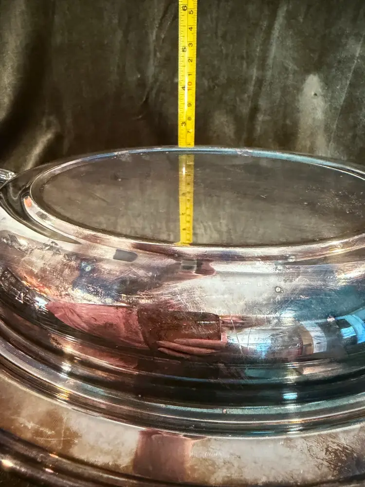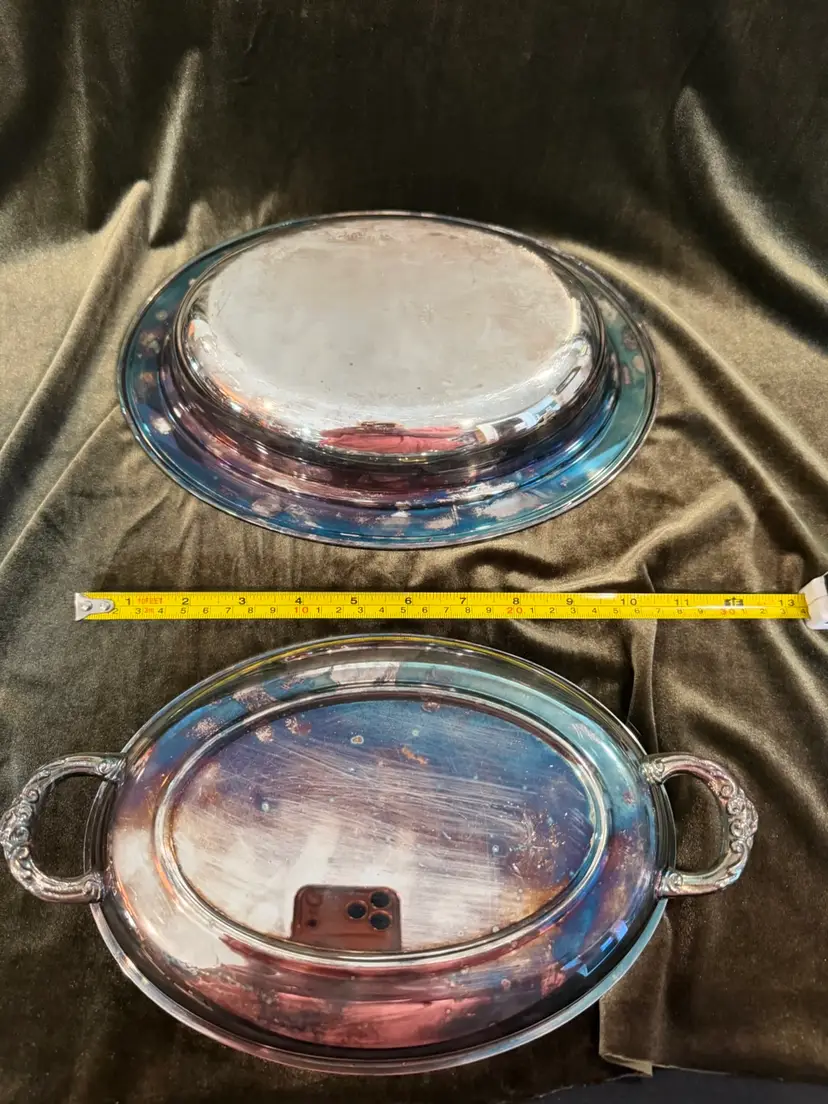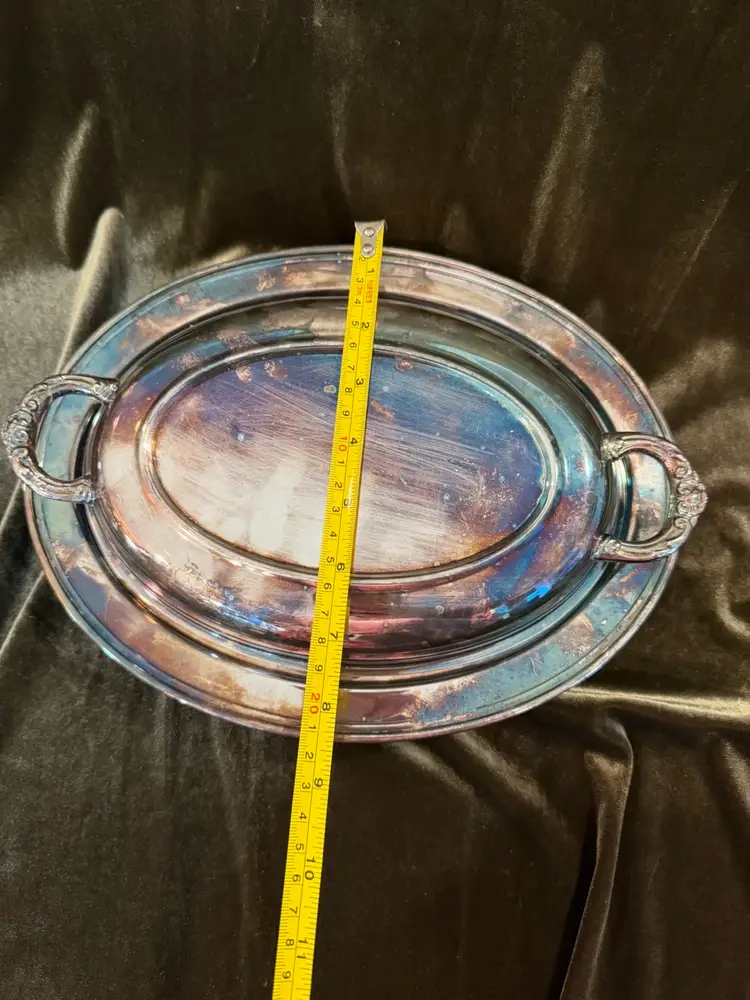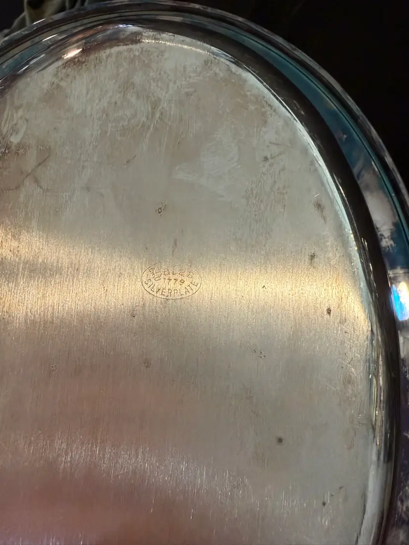 A vintage oval silverplate entree dish featuring a matching lid and decorative scroll handles, clearly marked with the Eales 1779 manufacturer stamp on the underside.