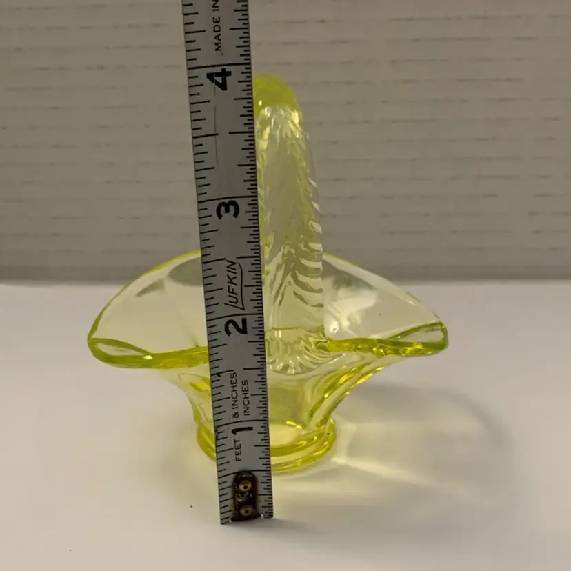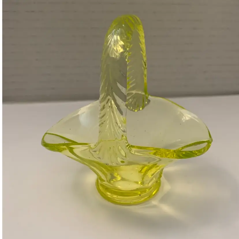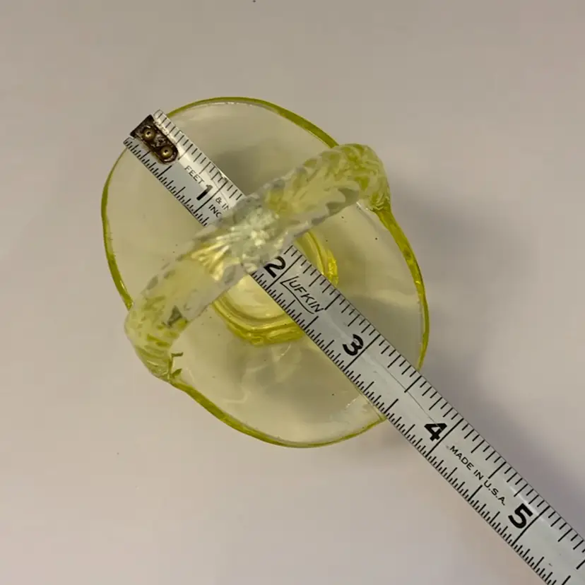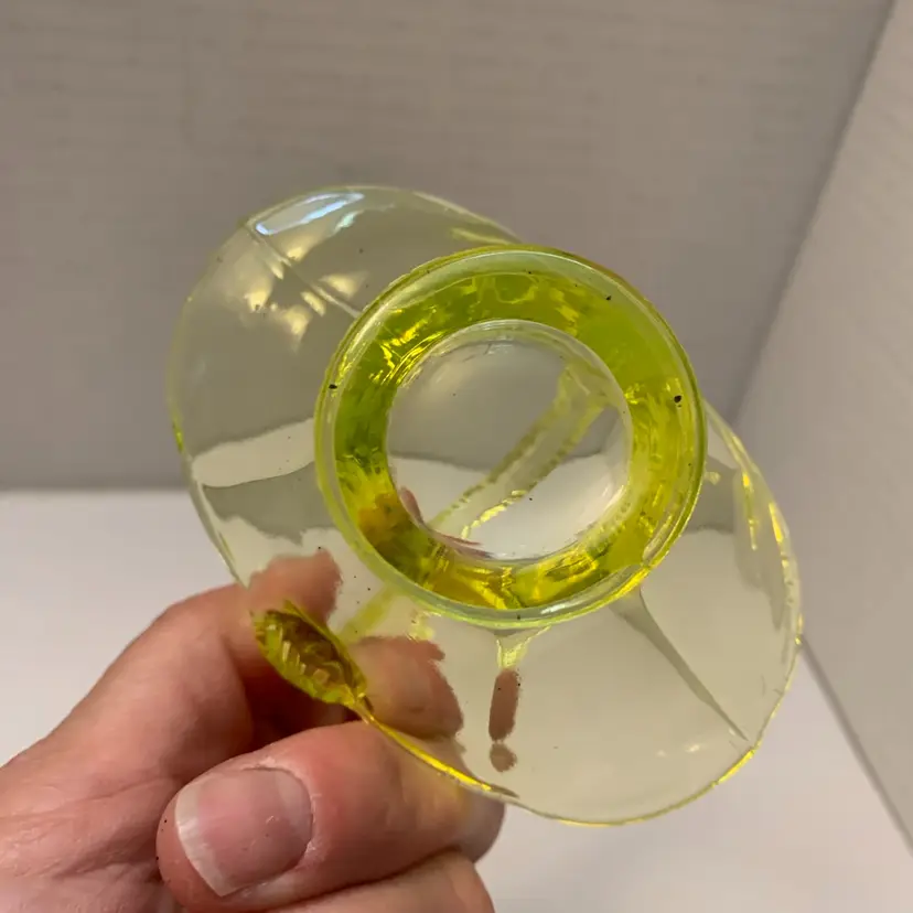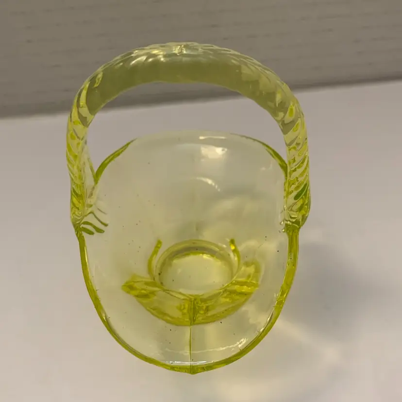 Pressed glass with an applied handle. Great little piece of uranium to add to someone’s collection. With no cracks or repairs. Two tiny chips on the bottom edge. Please see all photos for condition. Details and measurements. Thanks for checking out my listings.