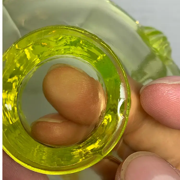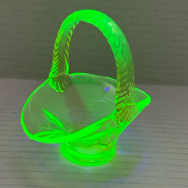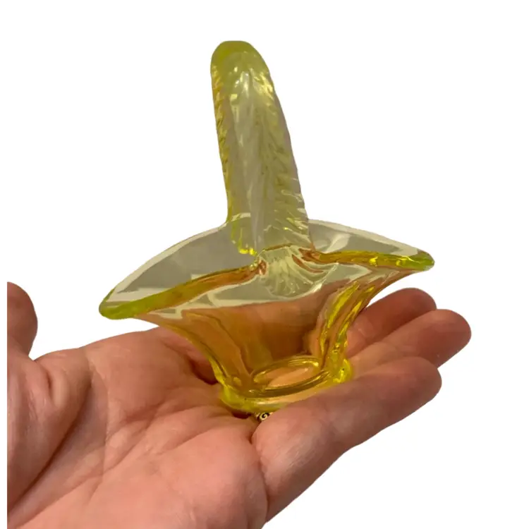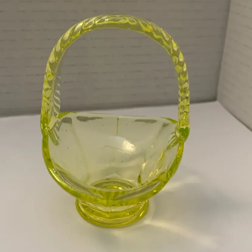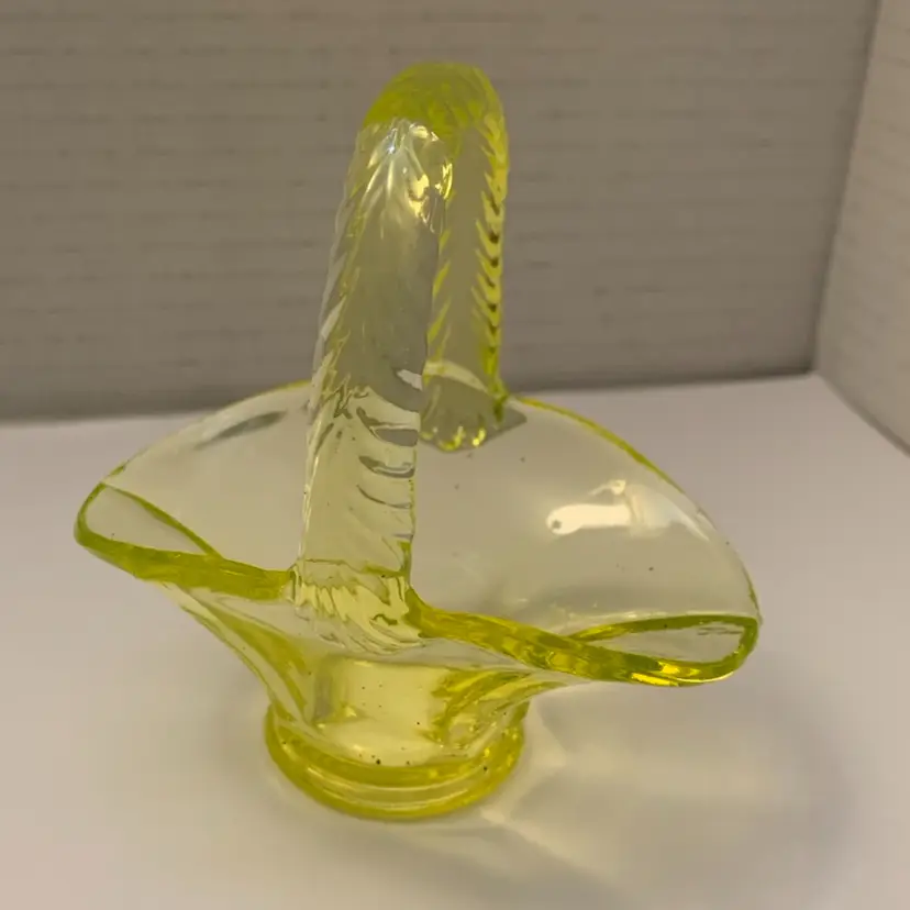 Pressed glass with an applied handle. Great little piece of uranium to add to someone’s collection. With no cracks or repairs. Two tiny chips on the bottom edge. Please see all photos for condition. Details and measurements. Thanks for checking out my listings.