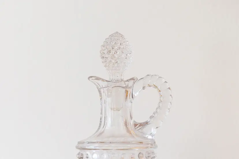 This lovely antique clear glass cruet features a classic hobnail (or “dew drop”) texture, a molded loop handle, and its original ground glass stopper. The base shows a true pontil scar — a sign that it was hand-finished rather than fully machine-made. The combination of these features places it in the early 20th century, during the transitional period when glassmaking shifted from hand-blown to semi-automated production (circa 1910–1930).