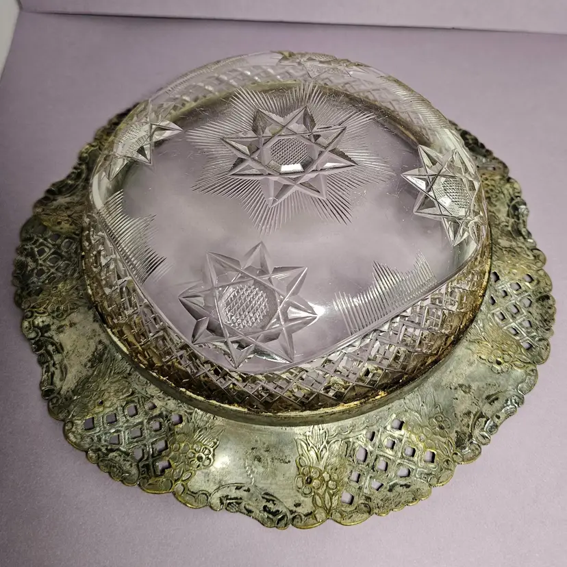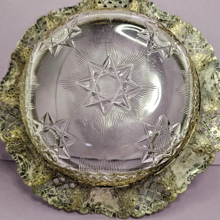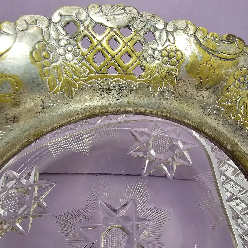 This bowl has seen a lot of history. The patina and wear on the intricate metal detail is beautiful. The trim is like a a piecrust with a beautiful punched pattern. This bowl could be used a key catch by your door or for pocket coins. The trim on the bowl is not going to shine up much. It has actual loss of the metal plating. The two colors if metal is what makes this bowl so unique and pretty. It was obviously well used in a previous life. It has so much history I just had to save it and I would be very happy for it to go to someone that loves it. Thank you for supporting my small business Beetle's Rucksack!