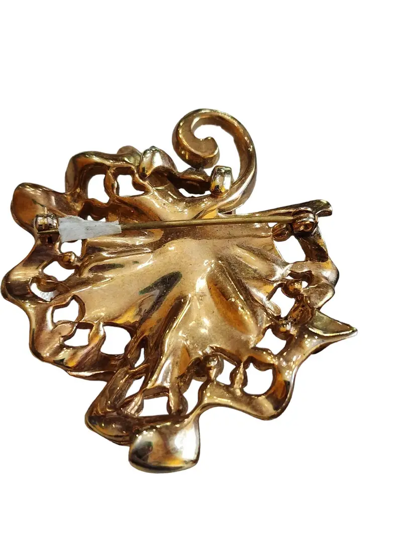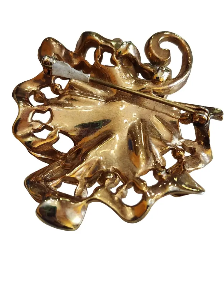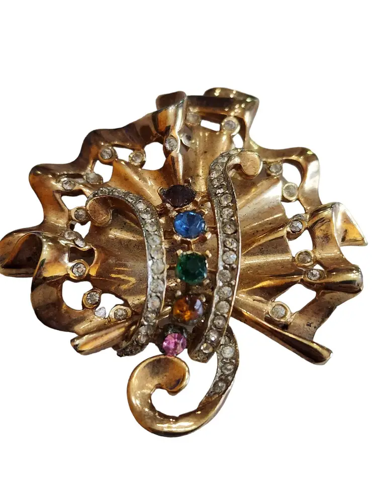 Size: About 2.25'' Color: Multicolor Condition: Good vintage; a few stones have been replaced, and there are a few tiny spots of pitting to the plating. Signed: None Details: Super well made! Not signed but looks like coro.