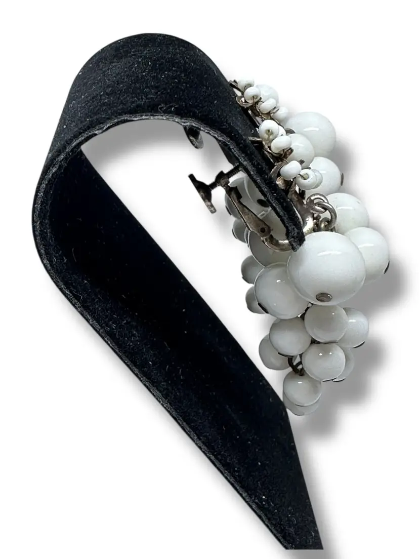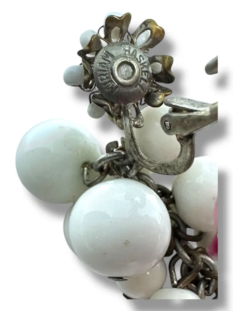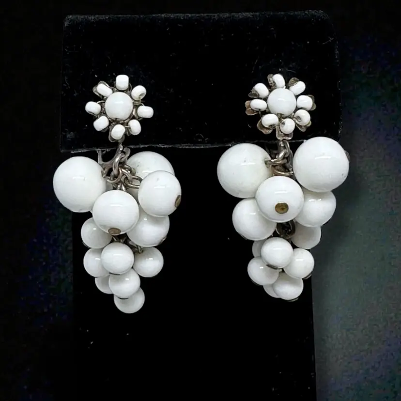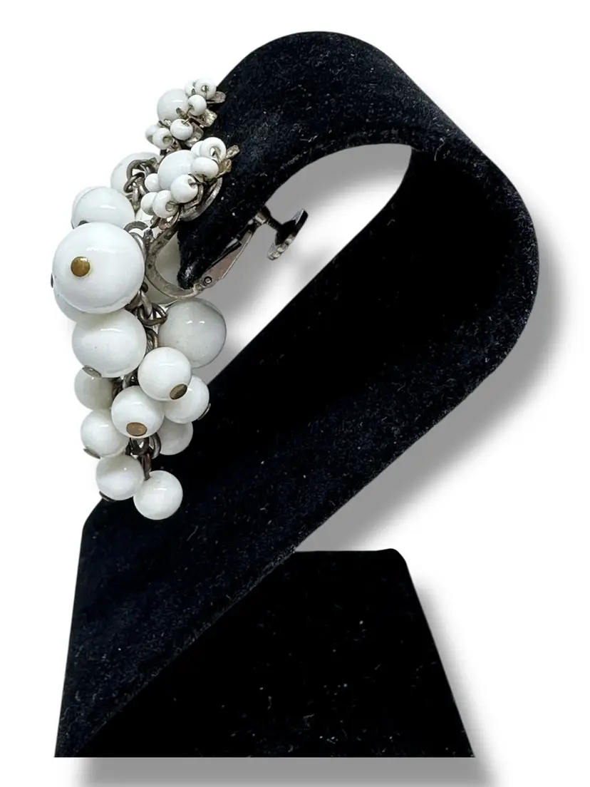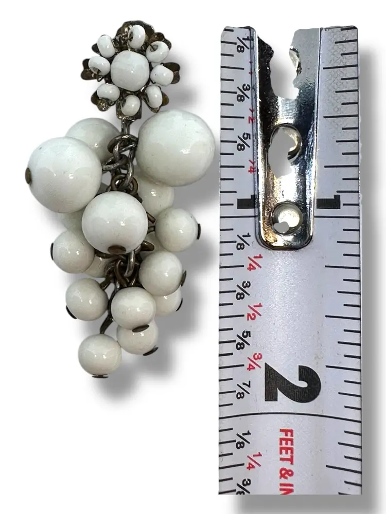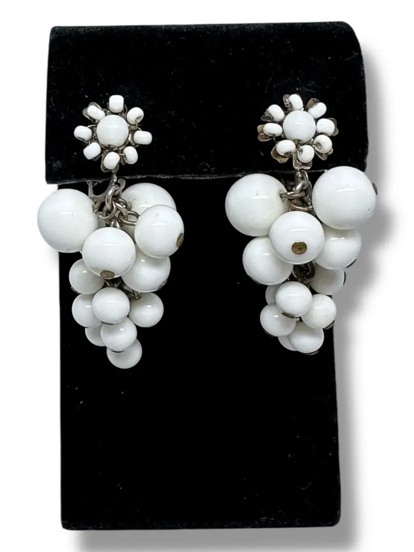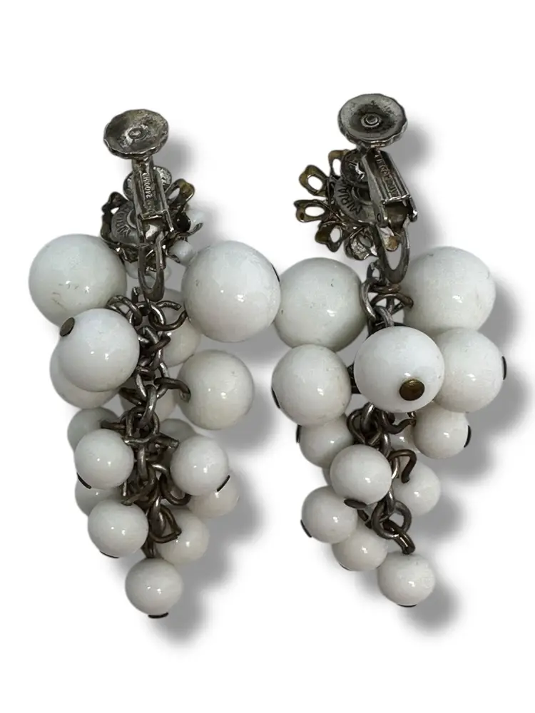 This product is a pair of vintage signed Miriam Haskell signed milk glass dangle cluster screw clip on earrings. The earrings feature an oval shape with a white milk glass. They are 2 inches in length and have a retro grape cluster style from the 1940s.