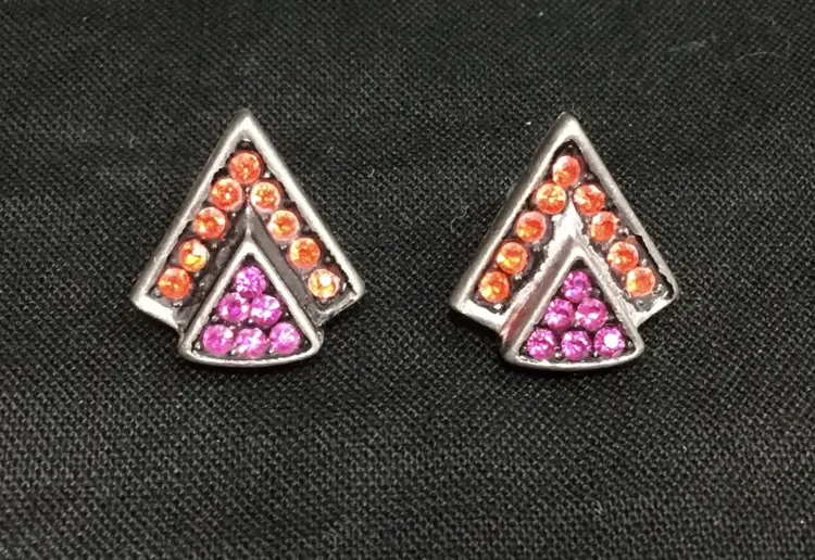 5/8 inch tall by 1/2 inch wide, chevron or arrowhead shaped post earrings. Black highlighting paint between and around rhinestones and on back. Pewter metal has been tested positive for containing lead. Posts are not pewter and have non-pewter, push on backs. Upper rhinestones are reddish- orange, lower rhinestones are bright pink. Very good condition, some of the blacking has come off the BACK of one earring (see all photos).