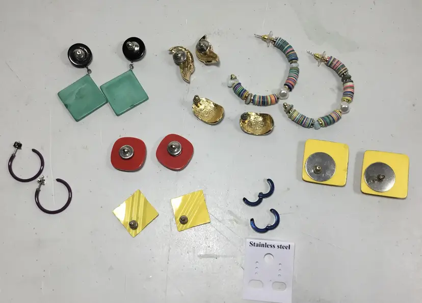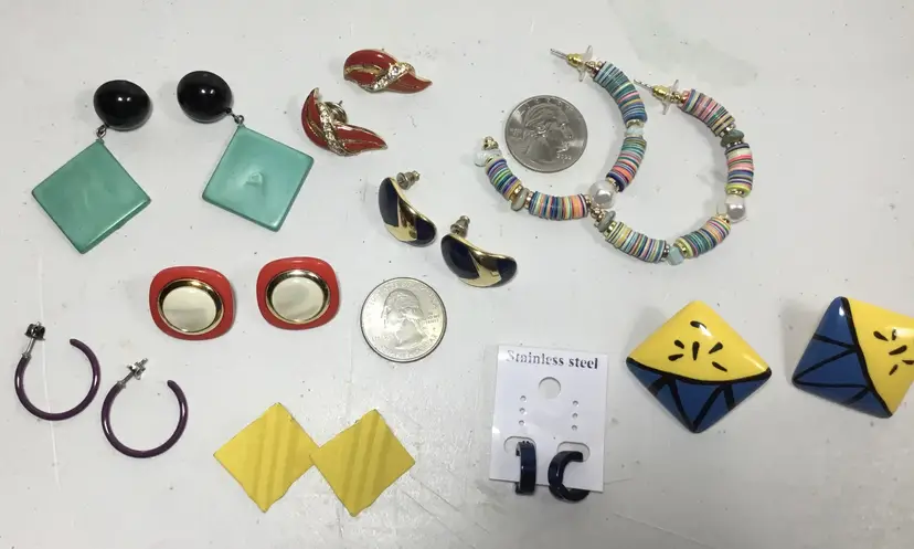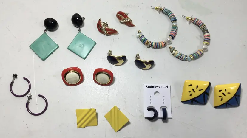 9 pairs of pierced earrings, all colorful, 8 have posts The small, blue metal rings open up and clip on. Made of metals, some with paint, some with acrylic parts. Very good condition, yellow metal earrings have 2 tiny spots of paint missing, yellow and blue earrings have small nick on back. See all photos.