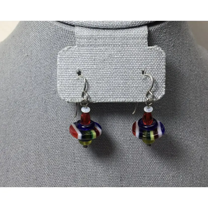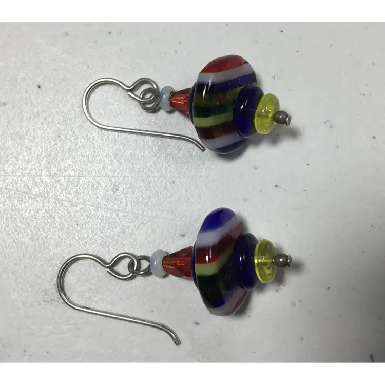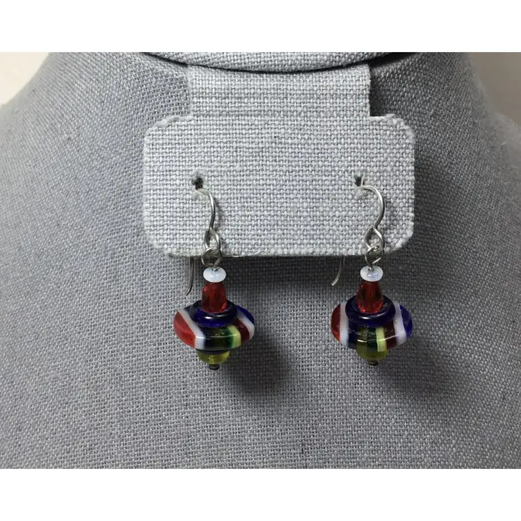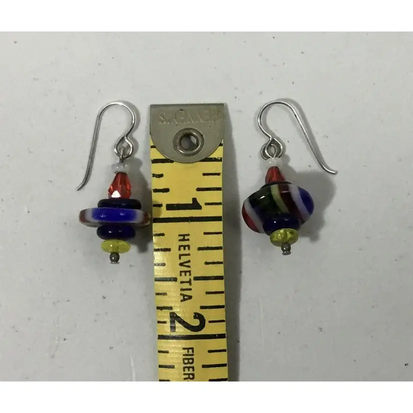 1.25 inches long, art glass bead disks on sterling wires. Red, white, blue, yellow with sterling bead and white, red, yellow glass beads. Used, tiny scratches on glass can't be seen except with microscope, slightly larger scratch on one red bead, also very difficult to see.