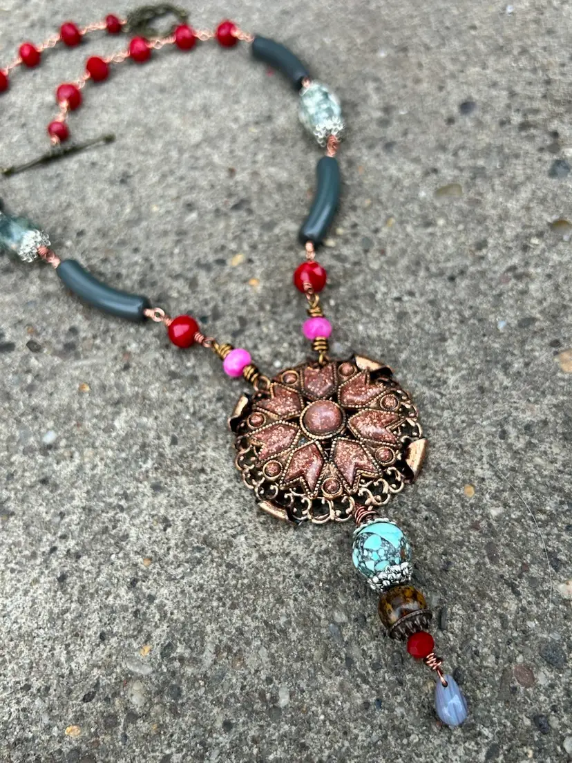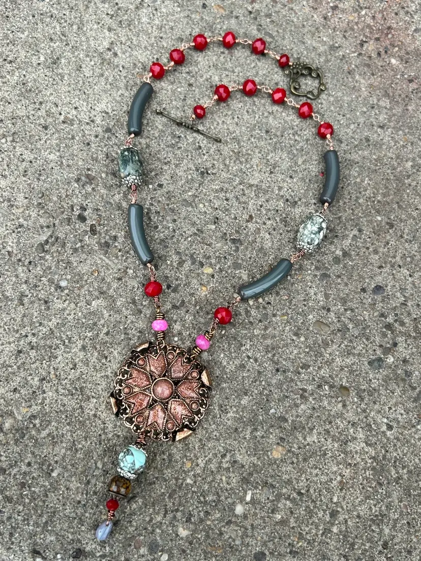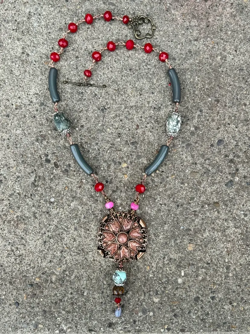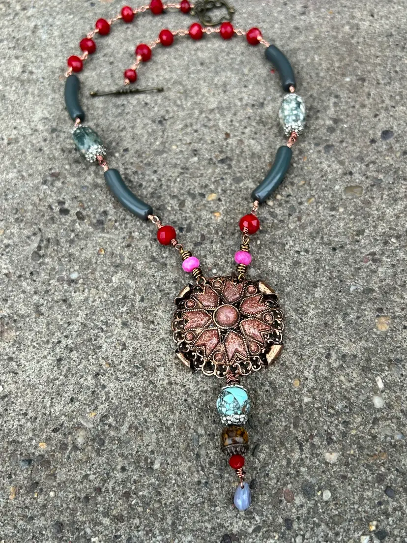 This beautiful mixed media design measures a total of 24” inches length, her pendant hangs down an additional 4”. She is lightweight and comfortable to wear. She features a brass toggle clasp closure , faceted crystal and glass beads, vintage curved lucite beads, composite gemstones, and a stunning copper and sandstone pendant upcycled from a vintage necklace. I used copper and antique copper wire (it’s a color not actual antique wire) she is sure to add a nice pop of color and some awe too your accessories & wardrobe.