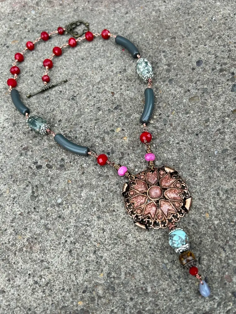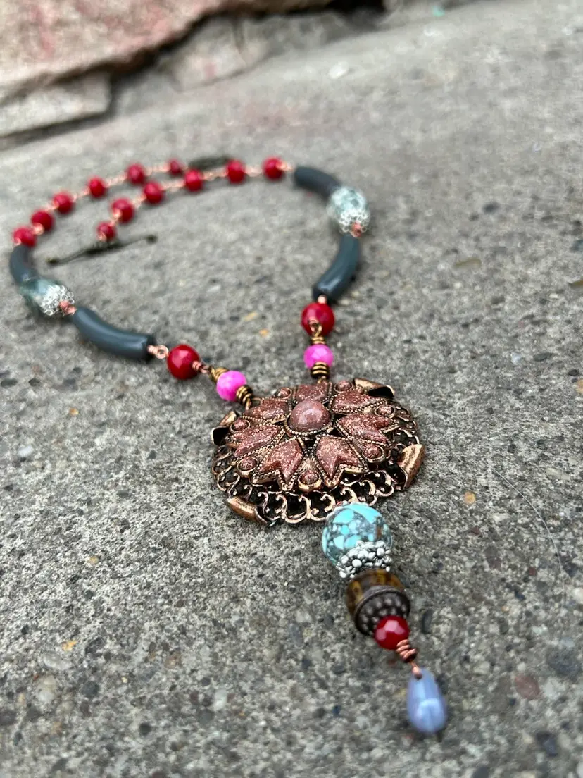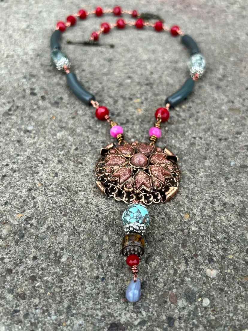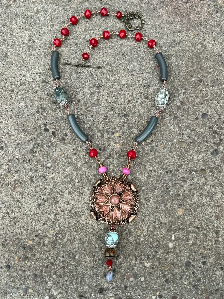 This beautiful mixed media design measures a total of 24” inches length, her pendant hangs down an additional 4”. She is lightweight and comfortable to wear. She features a brass toggle clasp closure , faceted crystal and glass beads, vintage curved lucite beads, composite gemstones, and a stunning copper and sandstone pendant upcycled from a vintage necklace. I used copper and antique copper wire (it’s a color not actual antique wire) she is sure to add a nice pop of color and some awe too your accessories & wardrobe.