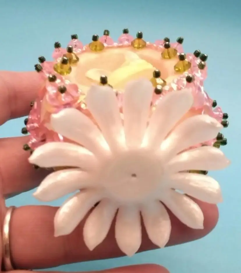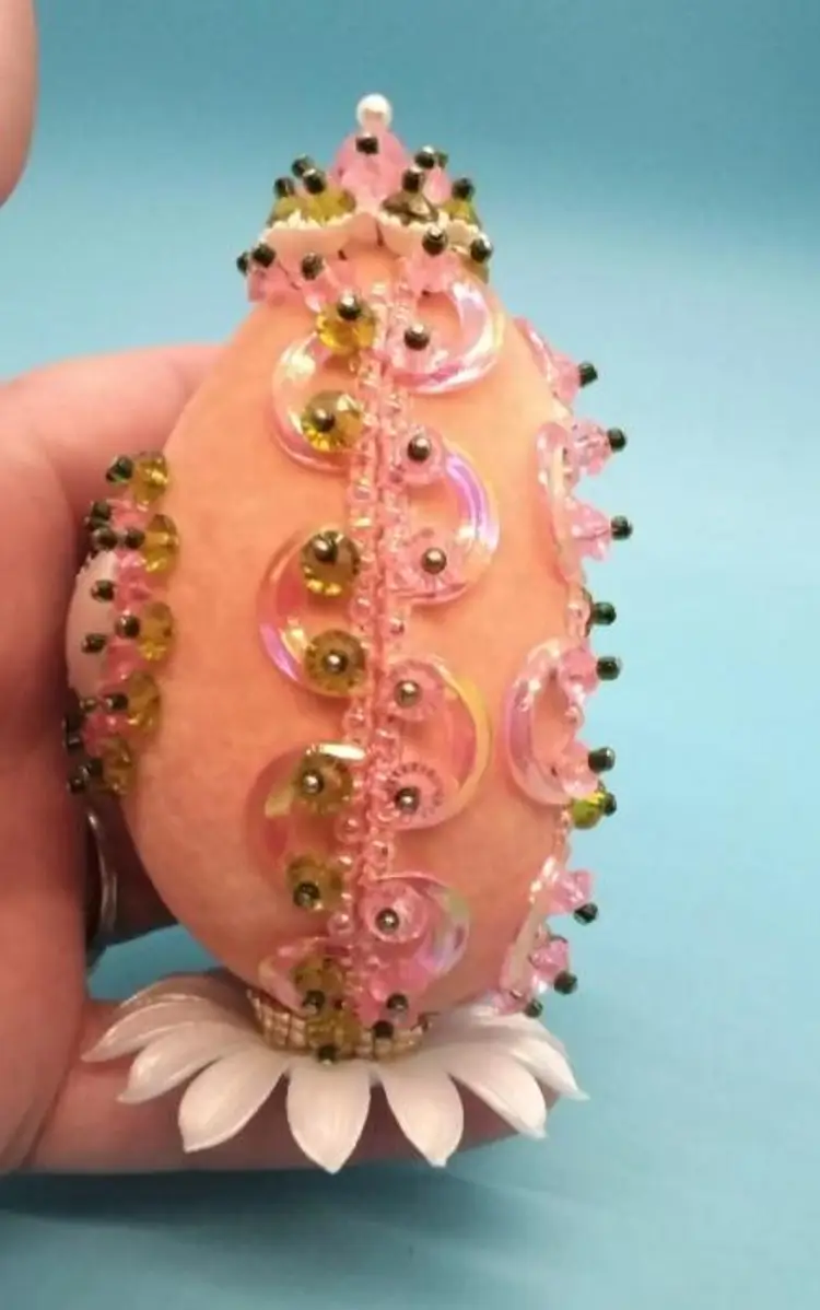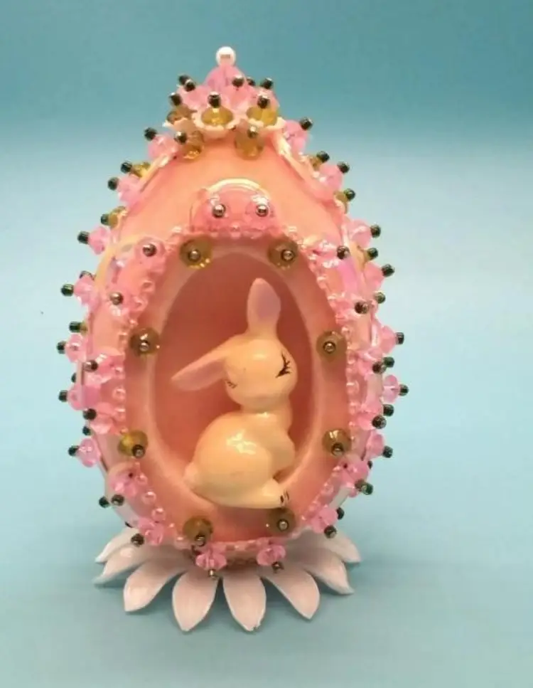 Easter Diarama. This pink flocked Easter egg, is adorned with beads of many shapes, and colors, with a plastic floral pedestal. It's diarama is an adorned Oval opening with an adorable bunny figurine inside.