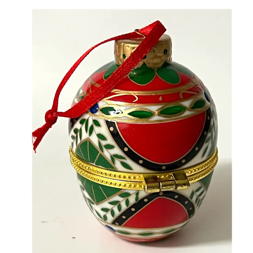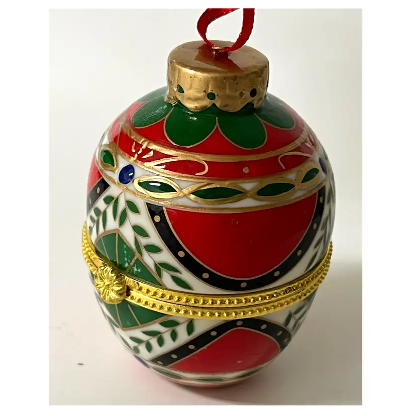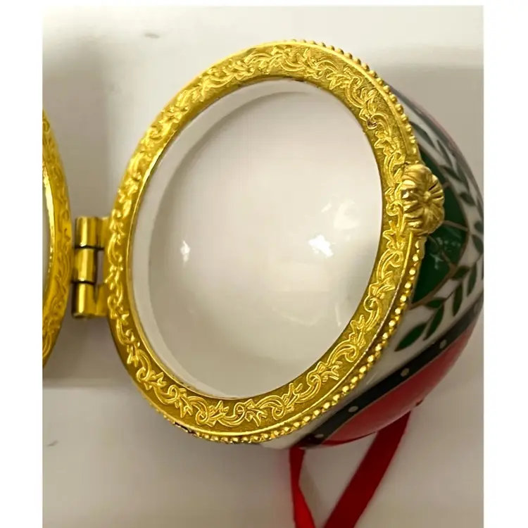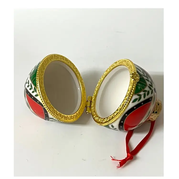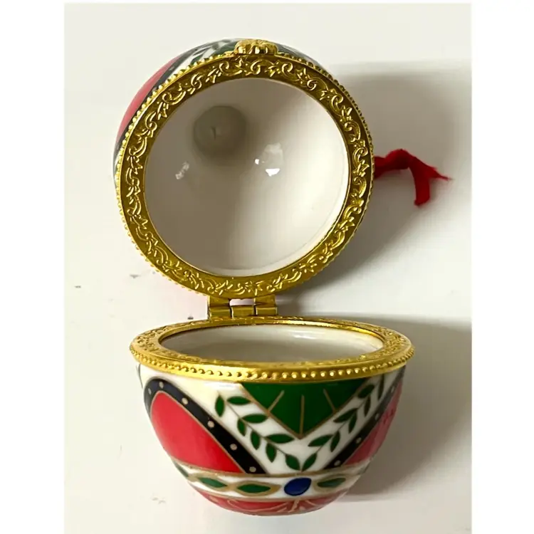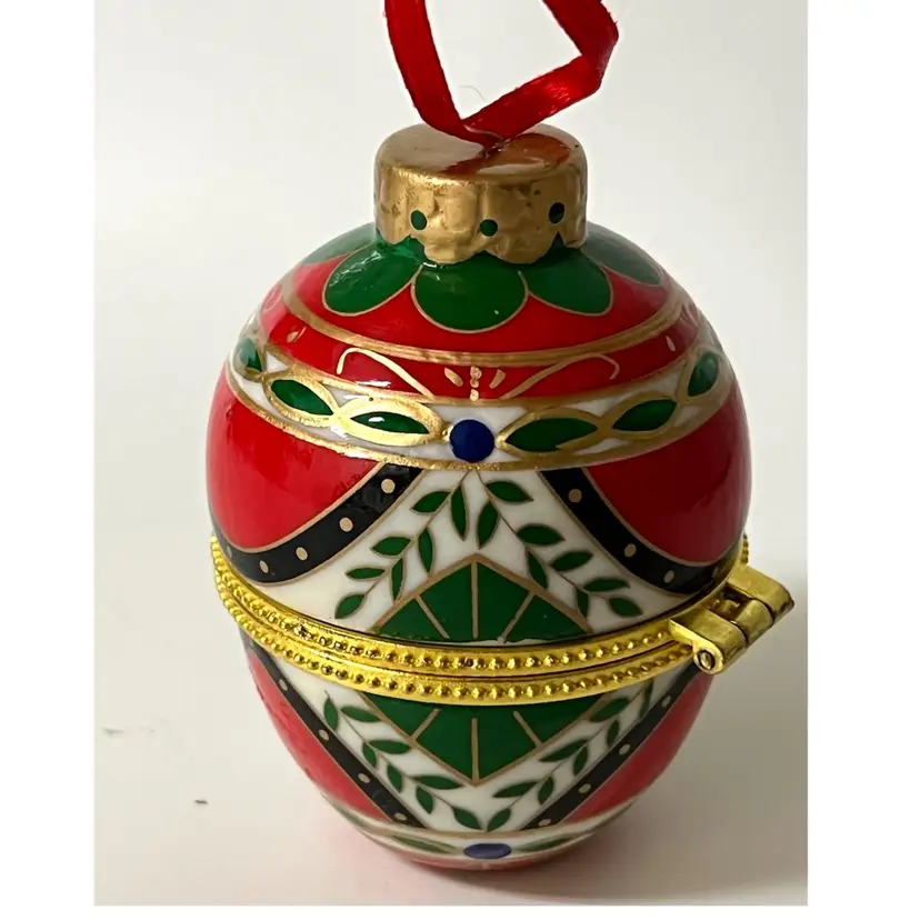 Easter Egg Shaped Christmas Trinket Jewelry Hinged Clasp Box Ornament. 3 in Height, 2 in Length. No chips/cracks