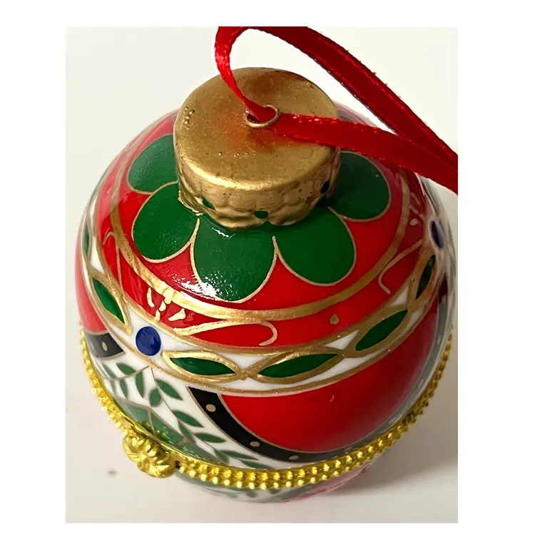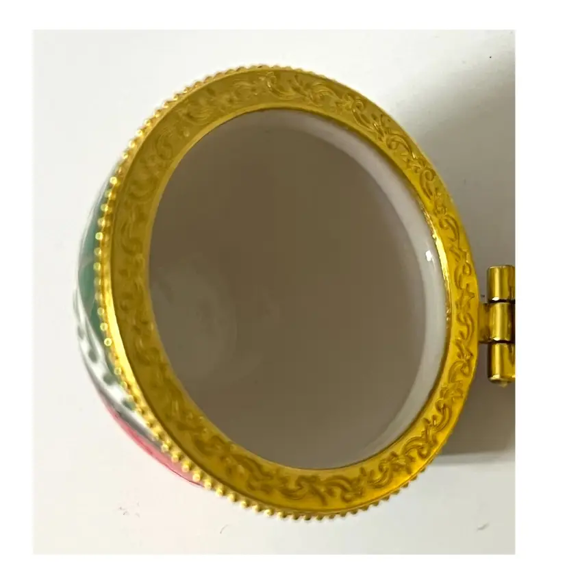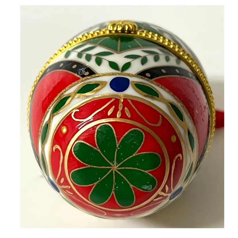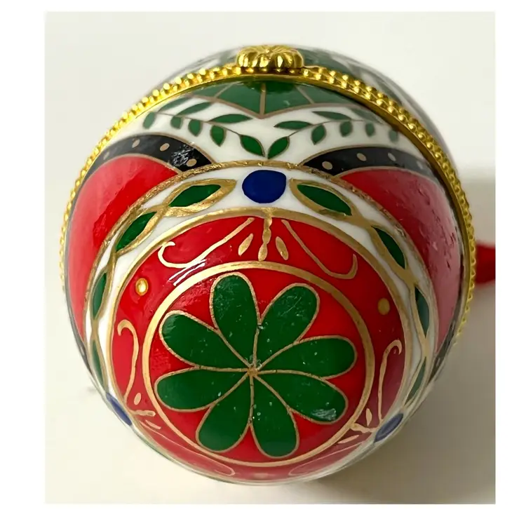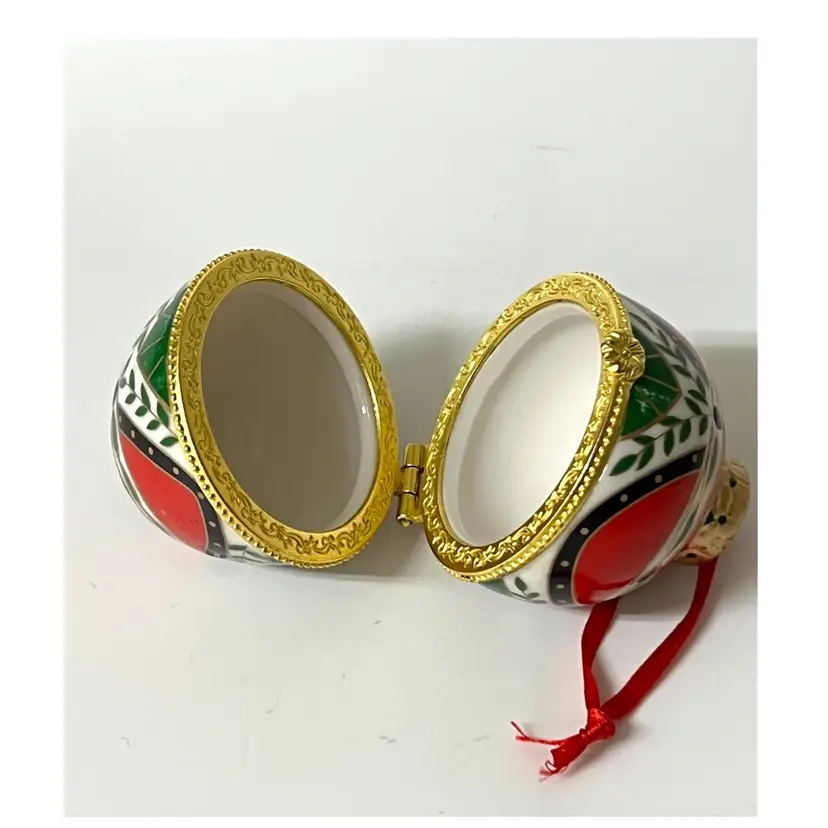 Easter Egg Shaped Christmas Trinket Jewelry Hinged Clasp Box Ornament. 3 in Height, 2 in Length. No chips/cracks
