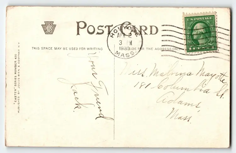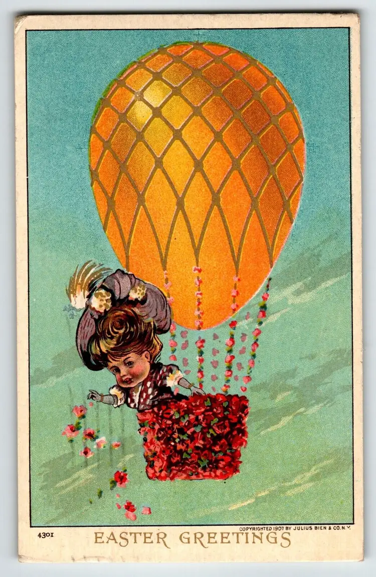 Unit of Sale: Single Unit Artist: Unknown Number of Items in Set: 1 Occasion: Easter Size: Standard (5.5 x 3.5 in) Custom Bundle: No Material: Paper Year Manufactured: 1910 Original/Licensed Reprint: Original Brand/Publisher: Julius Bien Subject: Fantasy Type: Printed (Lithograph) Unit Type: Unit Era: Pre-War (Pre-1914) Theme: Hot Air Balloon Features: Divided Back Time Period Manufactured: 1900-1919 Country/Region of Manufacture: Unknown Postage Condition: Posted