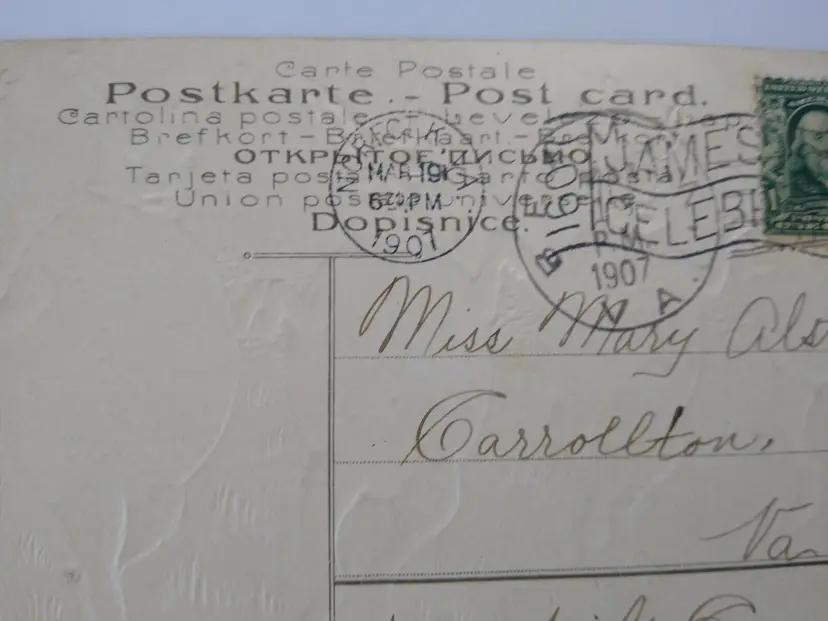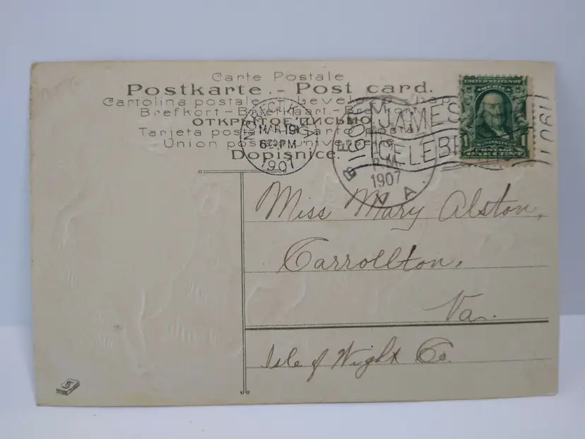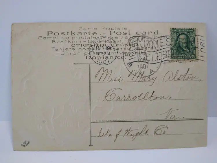 Antique vintage original embossed Easter postcard. Has writing, spotting, corner creases, and age wear. Writing on back. Posted with 1907 cancel and stamp. Markers logo on back Otto Schloss. Series 905. Stock# eas94.