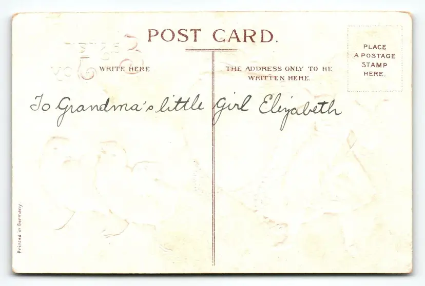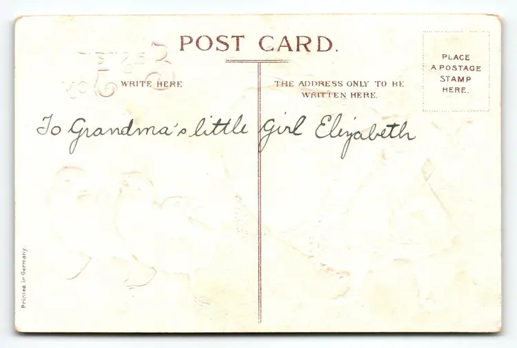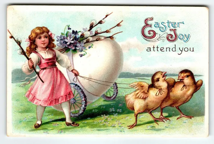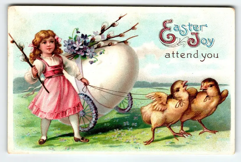 Number of Items in Set: 1 Unit of Sale: Single Unit Artist: Unknown Occasion: Easter Size: Standard (5.5 x 3.5 in) Signed: No Custom Bundle: No Material: Paper Year Manufactured: 1913 Original/Licensed Reprint: Original Brand/Publisher: International Arts Subject: Baby Chicks Personalize: No Type: Printed (Lithograph) Unit Type: Unit Era: Pre-War (Pre-1914) Theme: Art, Fantasy, Greetings, Holiday, Girl Features: Divided Back, Embossed Time Period Manufactured: 1900-1919 Country/Region of Manufacture: Germany Postage Condition: Unposted