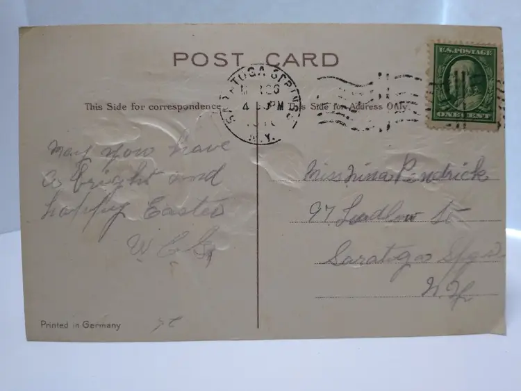 Size: Standard (5.5 x 3.5 in) Custom Bundle: No Type: Printed (Lithograph) Year Manufactured: 1909 Number of Items in Set: 1 Signed: No Original/Licensed Reprint: Original Occasion: Easter Time Period Manufactured: 1900-1919 Unit of Sale: Single Unit Era: Pre-War (Pre-1914) Artist: Unknown Country/Region of Manufacture: Germany Material: Paper Theme: Farm, Rooster, Chicks, Animals, Art, Greetings, Holiday Features: Divided Back, Embossed Subject: Chickens Postage Condition: Posted Brand/Publisher: EAS