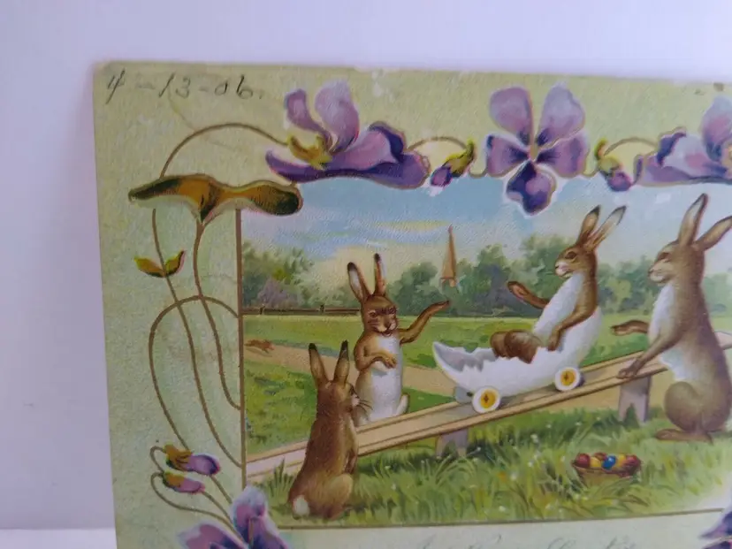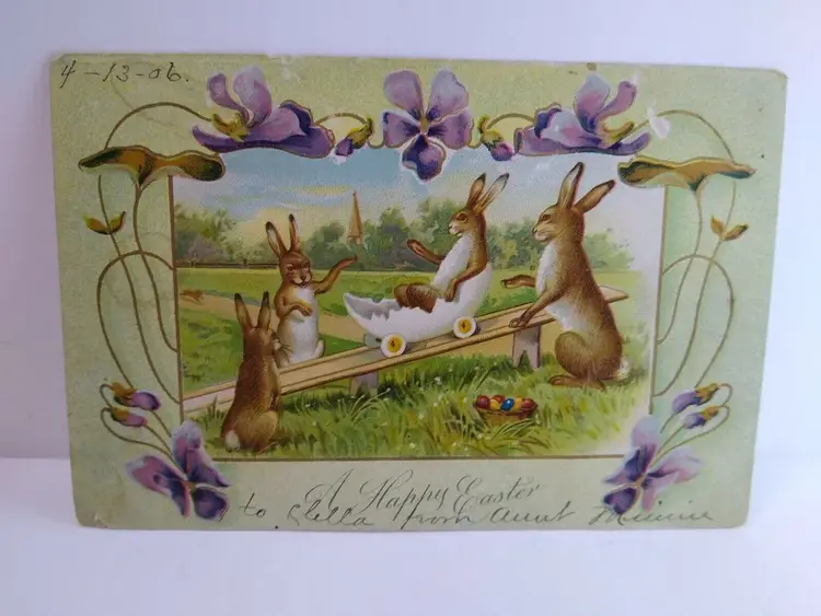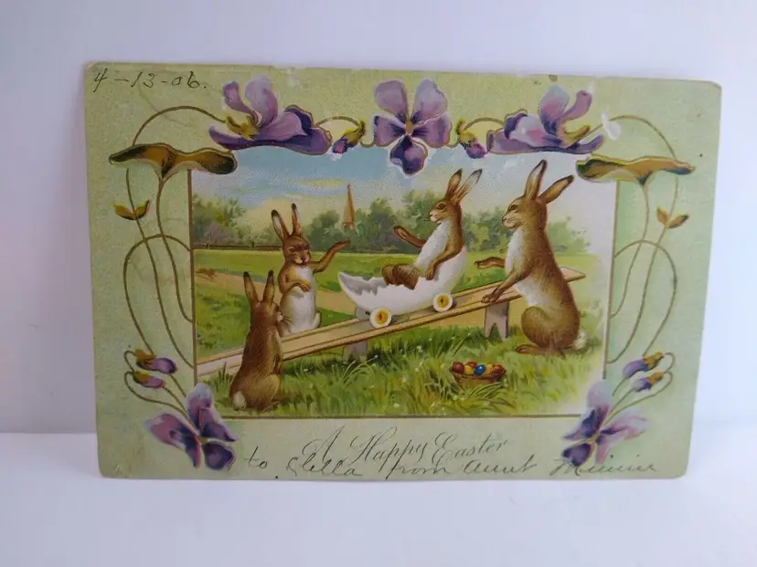 Antique vintage original Easter postcard. This is a plain back card. Has writing on front, edge nibbles, corner creases, and age wear. Non posted. Stock #eas53.