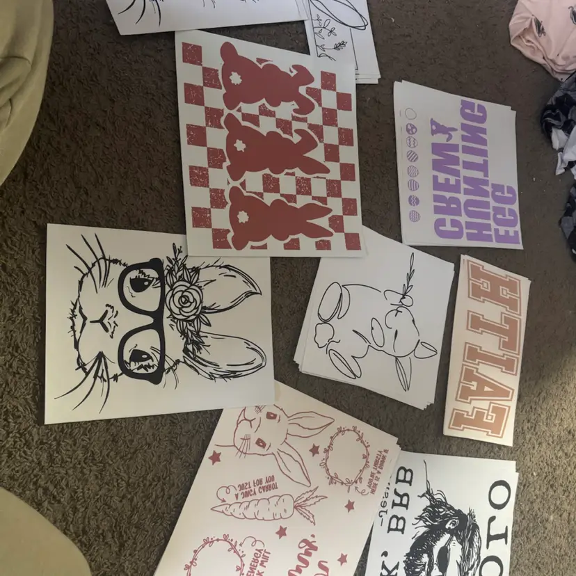 Checked bunnies - 4 Sunglasses bunny- 2 Glasses bunny -2 Bunny ears in garden- 10 Egg hunting crew- 4 Fine line bunny - 9 Faith- 4 YOLO Jesus- 2 Dear Easter bunny mat- 5