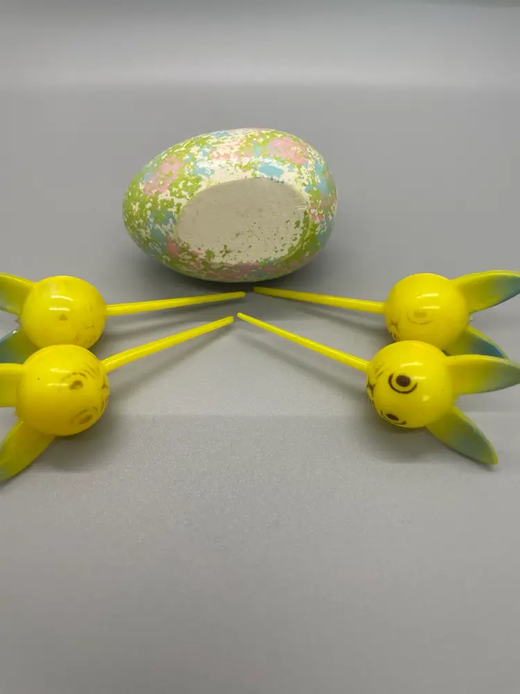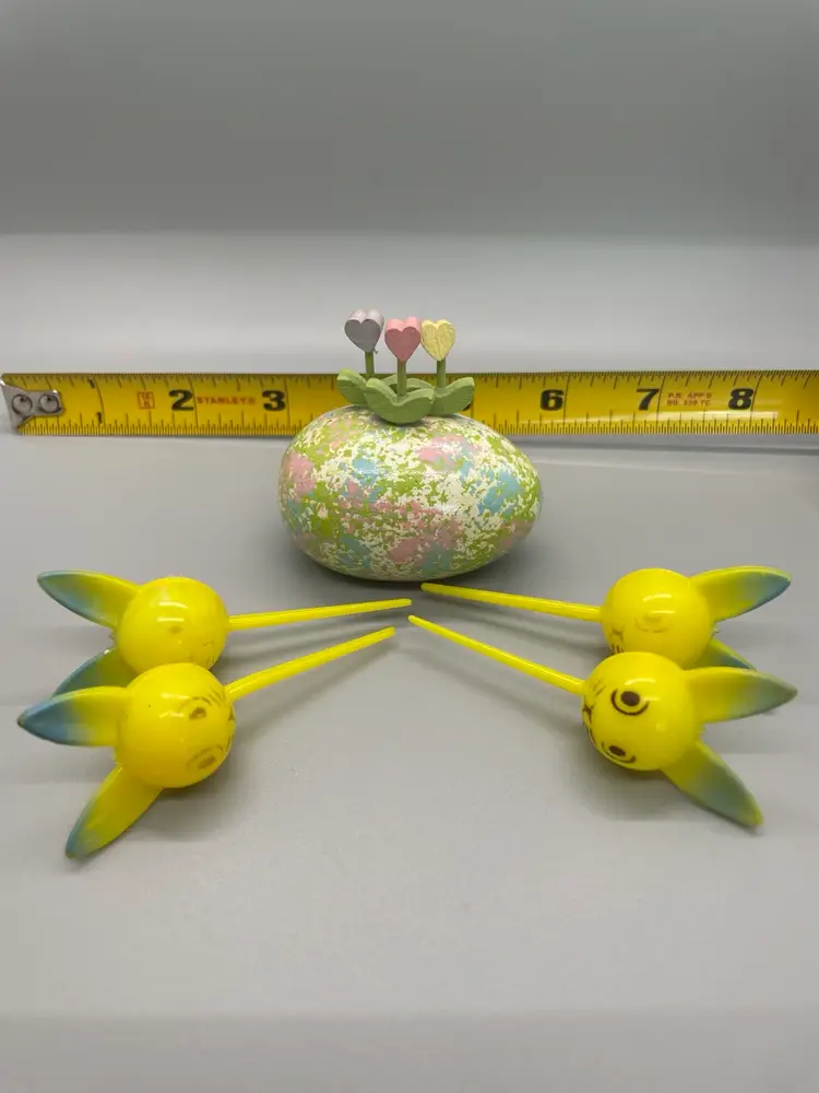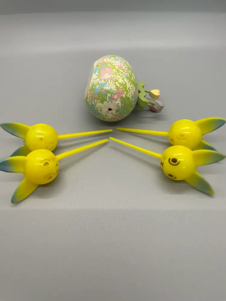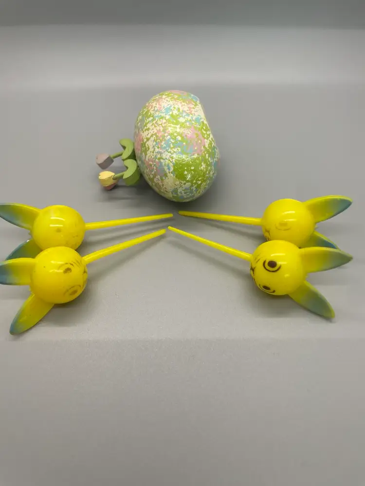Four Easter bunny plastic picks in good condition with varying degrees of face marking. Beautifully painted wood egg in good condition. Great grouping for crafting!