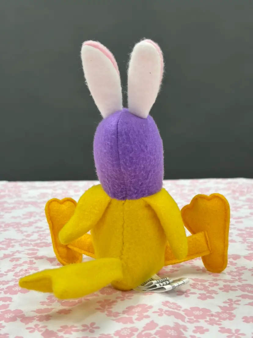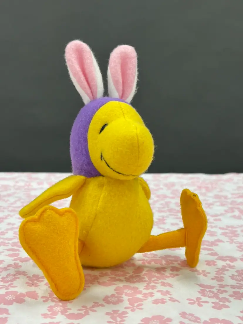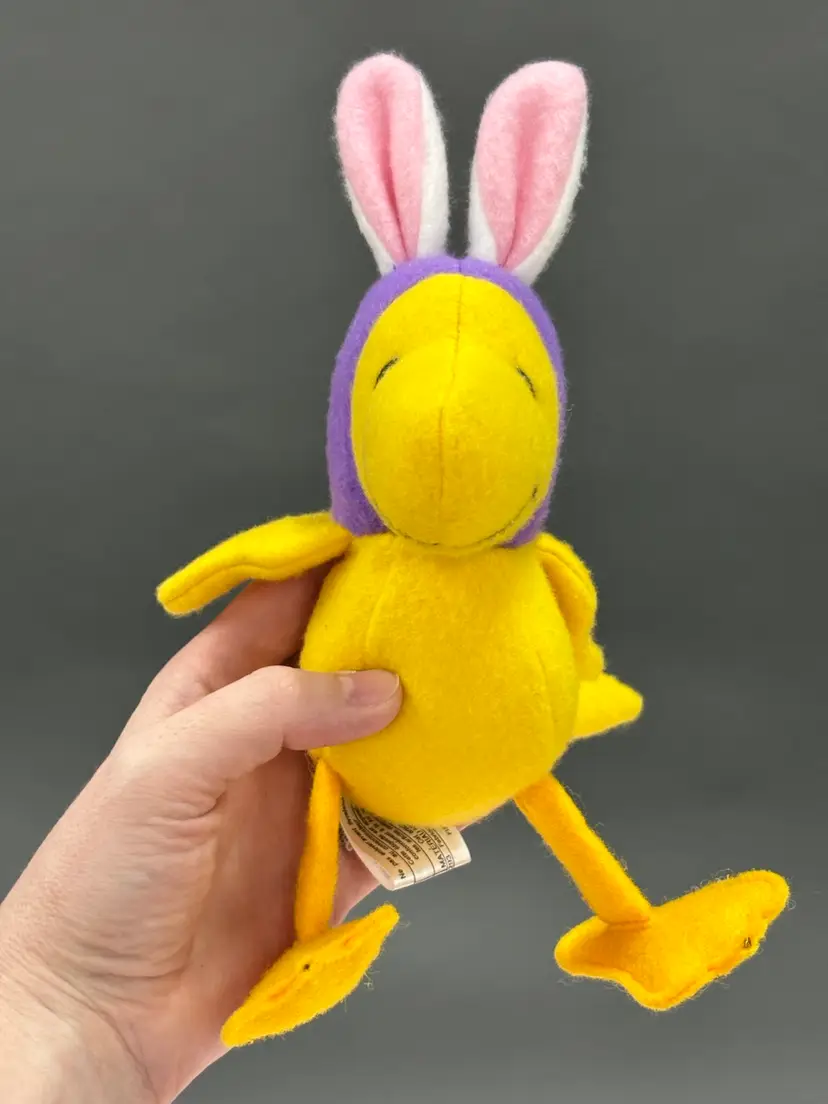 Vintage Woodstock plush made by Determined Productions for Whitmans. This Woodstock is wearing a purple hood with bunny ears. Approximately 5 inches tall without the ears when sitting, and 7 inches with the ears. Total length is approximately 8.5 inches including the ears and feet. Would be a super cute addition to any collection!