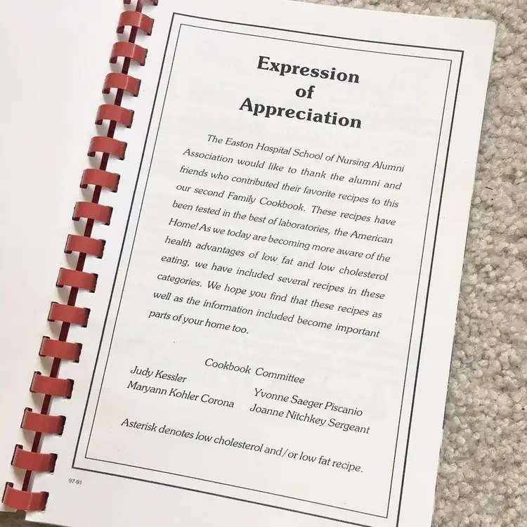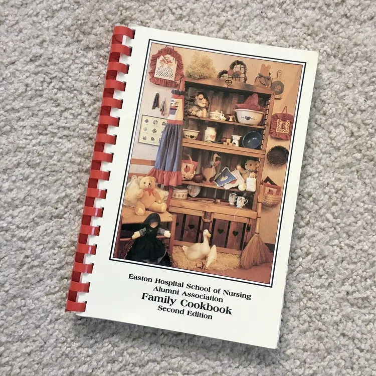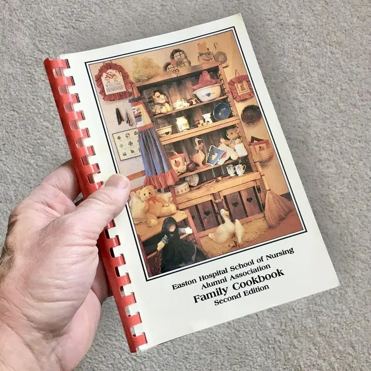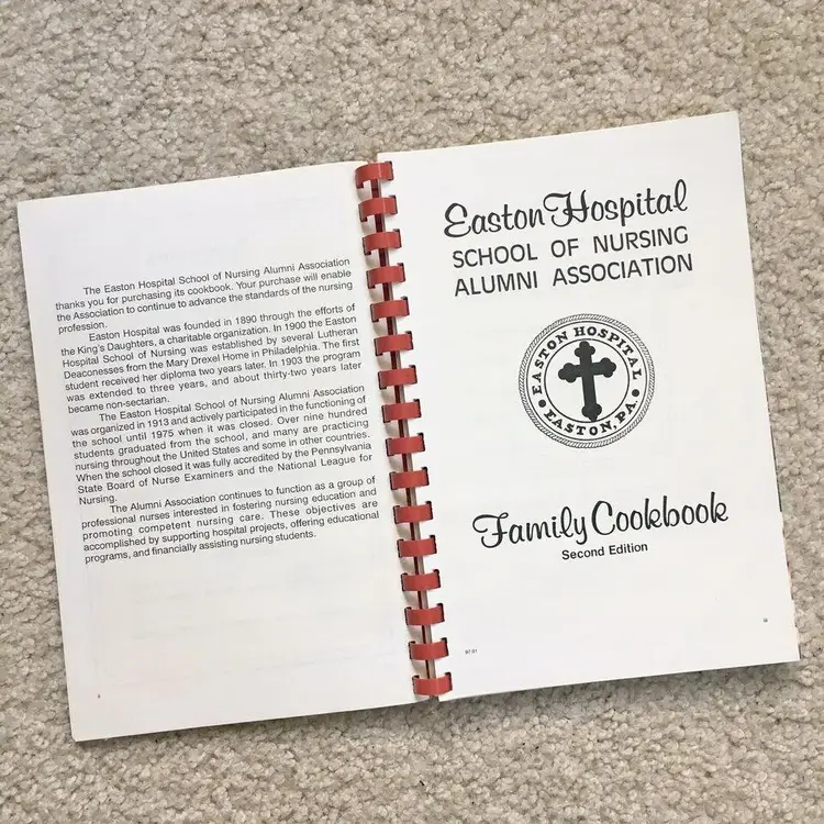 Easton Hospital School of Nursing Alumni Association FAMILY COOKBOOK, 2nd Edition, Copyright 1991, Paperback, Spiral Bound, 72 pages. Easton, Pennsylvania hospital nurses best recipes for breads, desserts, soups, salads, main dishes, appetizers, candy, beverages, etc. Also includes Kitchen Hints, Cleanup Tips and Calorie Counter. Very good overall condition with minor wear from age and use. Pages are clean. See pics for more details.