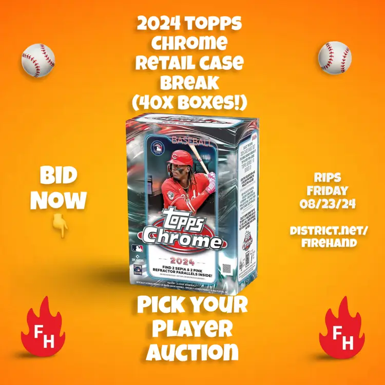 You are bidding on all the cards of the player listed in the title in this RETAIL Case (40x Blaster Boxes!) of 2024 Topps Chrome Baseball Cards. Auctions end Thursday 8/22/2024 and case rips on Friday 8/23/24. Opening will be viewable & simulcast on Firehand Cards District as well as YouTube. US Shipping is $5.00 for your first auction spot won and only $.25 per additional spot won after that! Any spot won where no cards of the player are found in the box will receive a bonus card or pack from the Firehand collection. Any multi-player base cards will be split as fairly as possible between the spots of the players depicted on the card. Any hit pulled (On the Spot, Sketches, Hidden Gems etc) of a player who is NOT listed in the auction will be assigned by draw between all participants. Any dual or multi-player #'d or auto cards featuring multiple players will be assigned live between the spots depicted on the card.