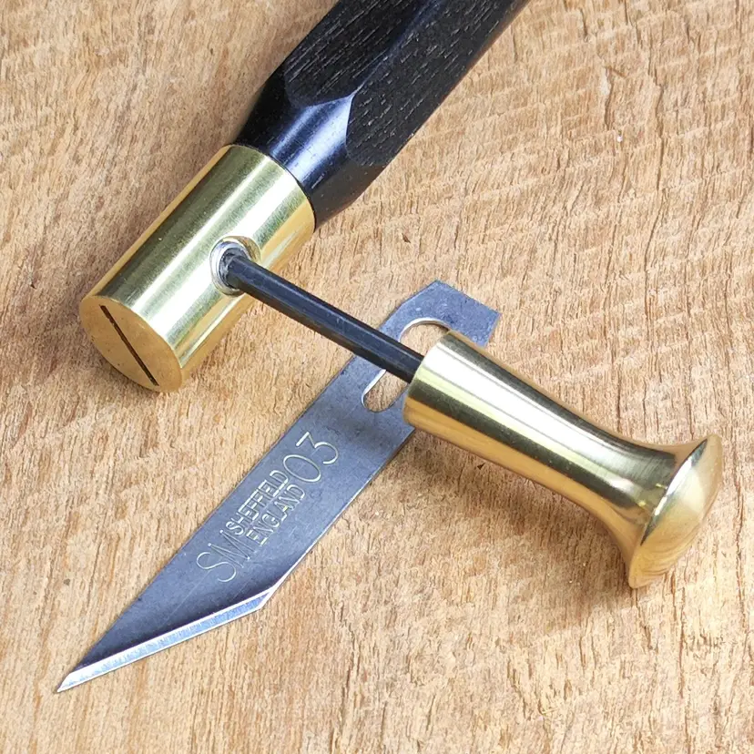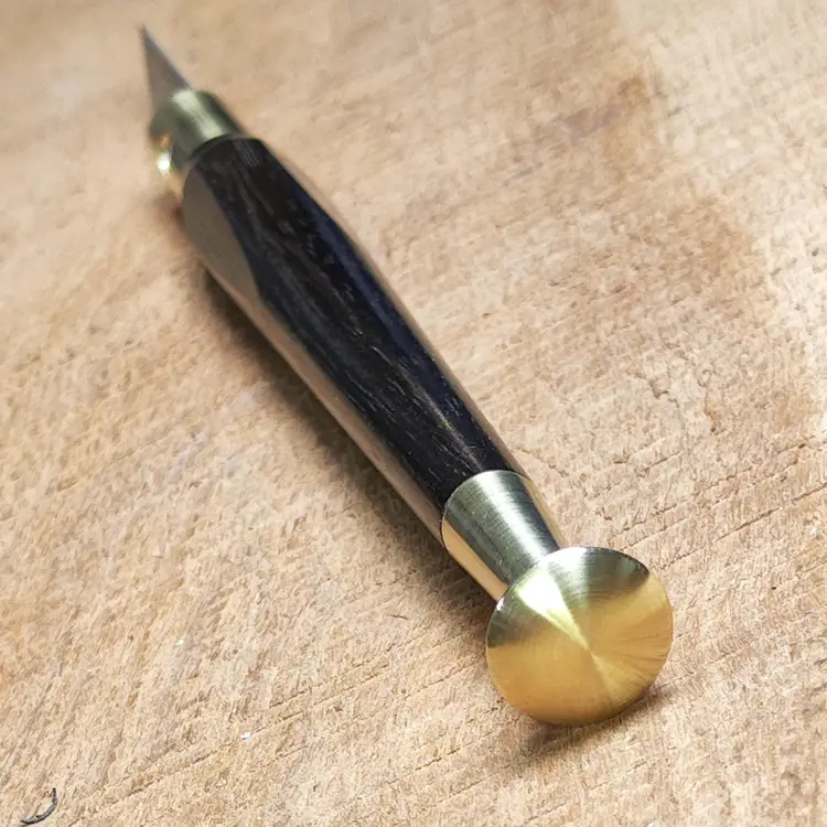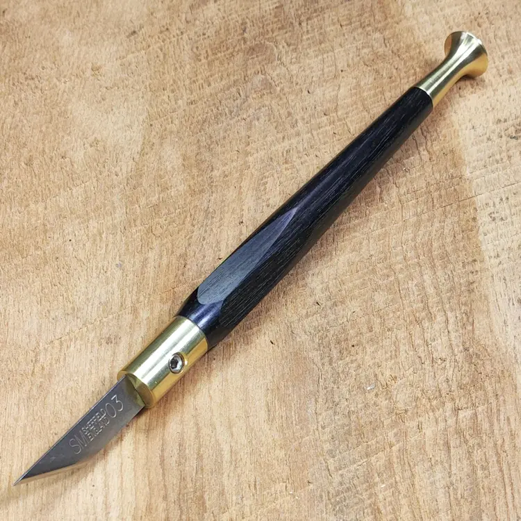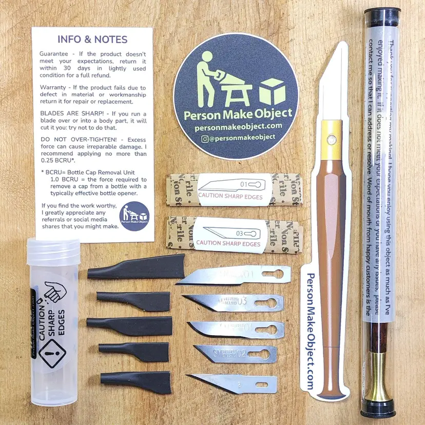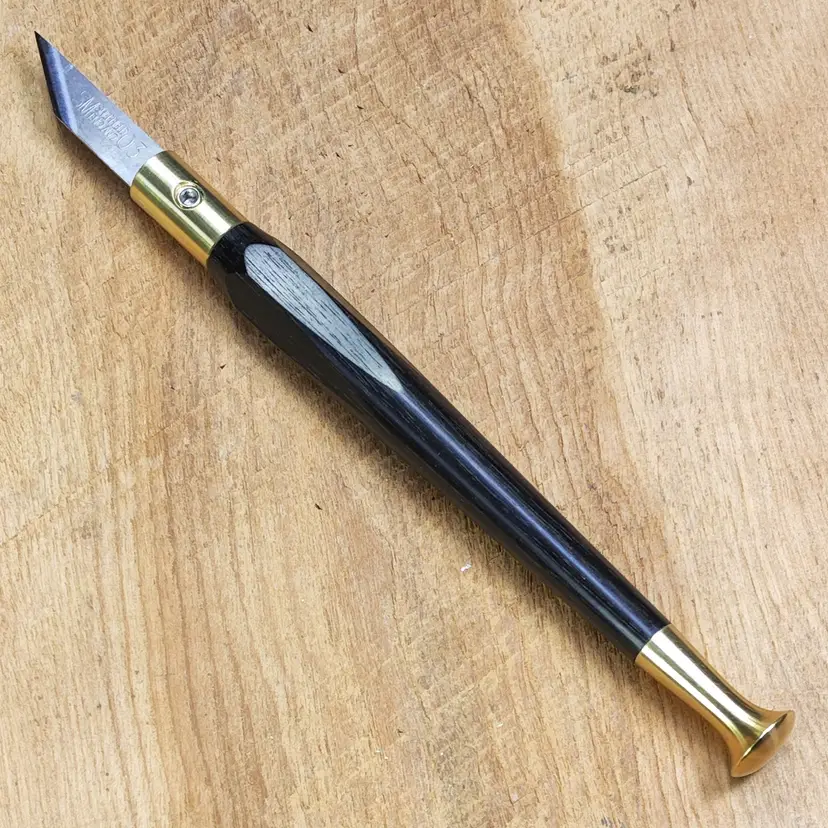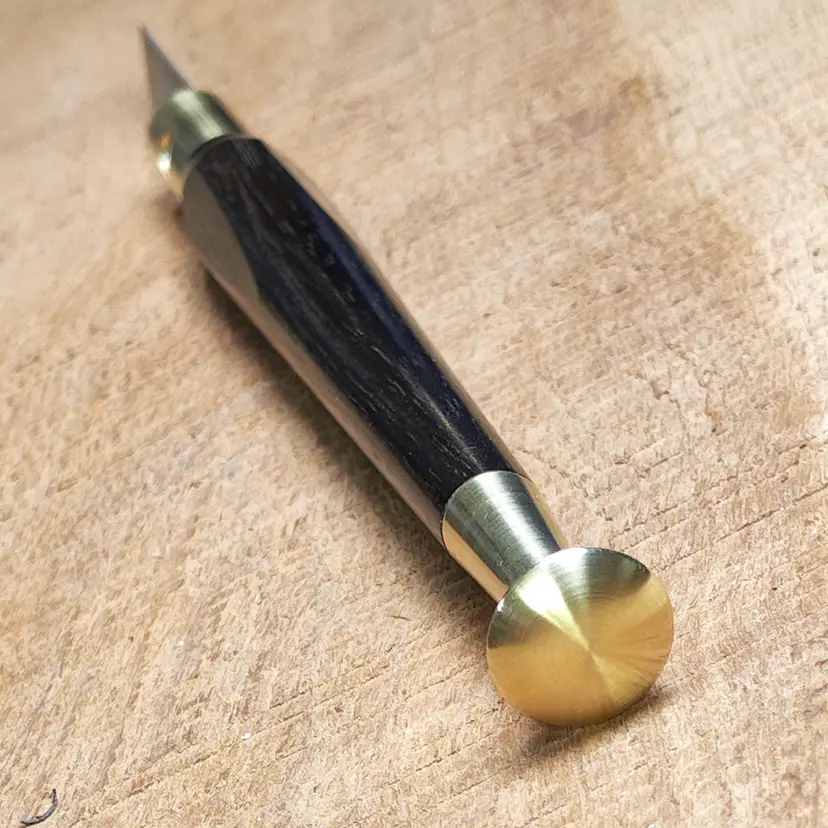 This replaceable blade knife holds blades by Swann-Morton or xacto 2/B sized blades. It works great for marking out joinery, marquetry/inlay, leatherwork, papercraft, scale modeling, and all sorts of crafts and making. The brass hardware and handle are made by me from scratch in my basement shop. The hexagonally faceted contoured handle (modeled after my favorite vintage xacto knife) feels great in the hand, lends detail control, and won't roll off your bench. The brass blade wrench snaps onto a rare earth magnet embedded in the handle with a satisfying click! Holds Swann-Morton 01-04 or xacto 2/B blades. Includes 9 blades, 5 covers, 2 storage tubes, and some stickers and stuff. 100% Satisfaction Guarantee – If the product does not meet your expectations, return it in lightly used condition for a full refund. Lifetime Warranty – If the product should fail due to defect in material or workmanship before the I die or am incapacitated, return it for repair or replacement. I have others on hand in a variety of materials and configurations and I build to order, message me for more details.