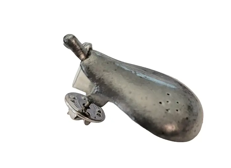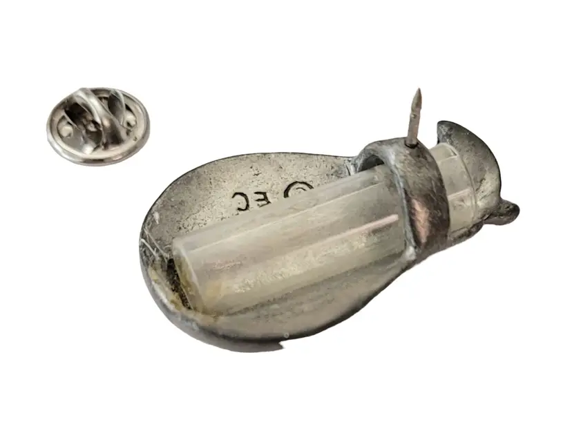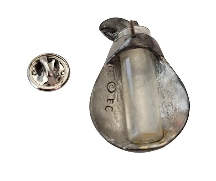 This EC Pewter Lapel Pin will add a touch of vintage glamour and personality to your ensemble. It features a pear-shaped figure crafted from pewter, it has a clear glass bottle or a vial on the back, where you can put a small piece of flower, your favorite essential oil, and carry your signature scent wherever you go. It measures approximately 1.6 inches in length. Marked ©EC on the reverse, it has a butterfly clutch that functions properly, is easy to fix on the back, and can be firmly attached to your lapel or necktie.
