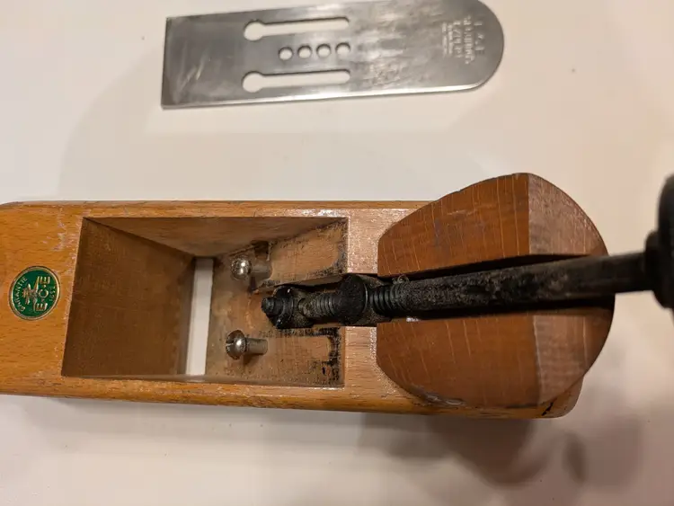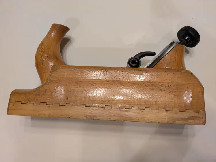 This is a nice little continental style jack plane. It's 9.5" long and has a Norris style depth adjuster, a beech body and hornbeam sole. There is no lateral adjuster on this plane. There are some very small gaps in the lamination for the sole on one side only, but these haven't moved or spread in the year and a half since I bought this plane.