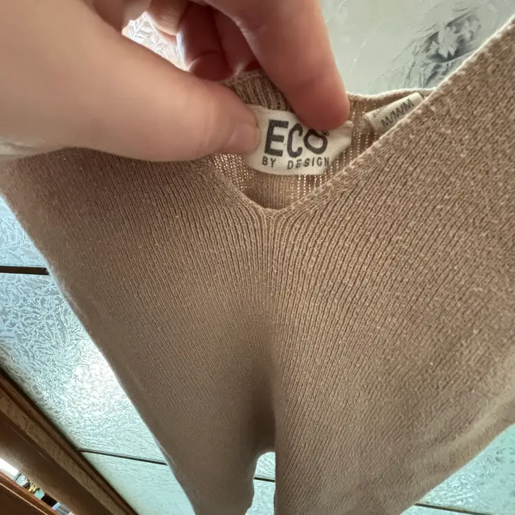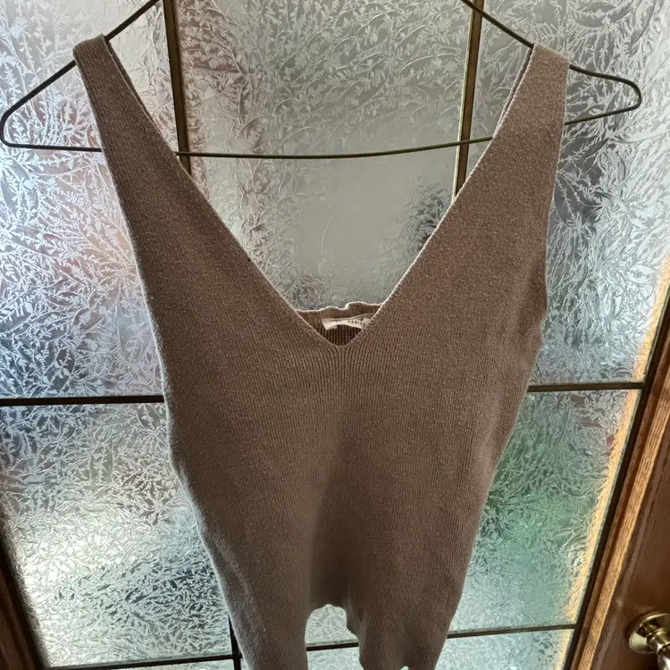 Soft knit V-neck tank. Sleeveless with a flattering deep V front. Lightweight and versatile for layering. Neutral taupe color pairs easily with other pieces. 15” - 20” pit to pit.