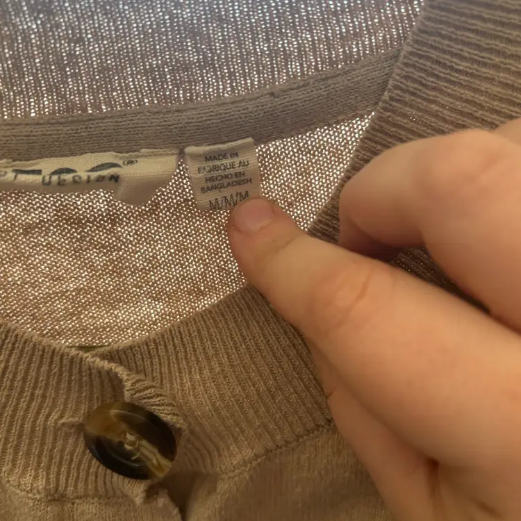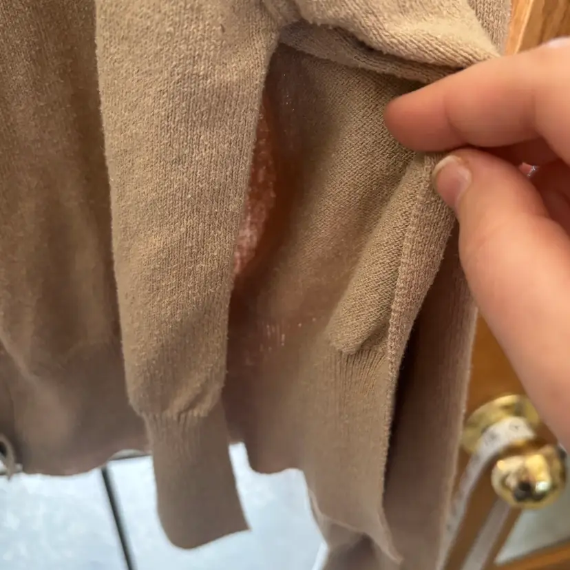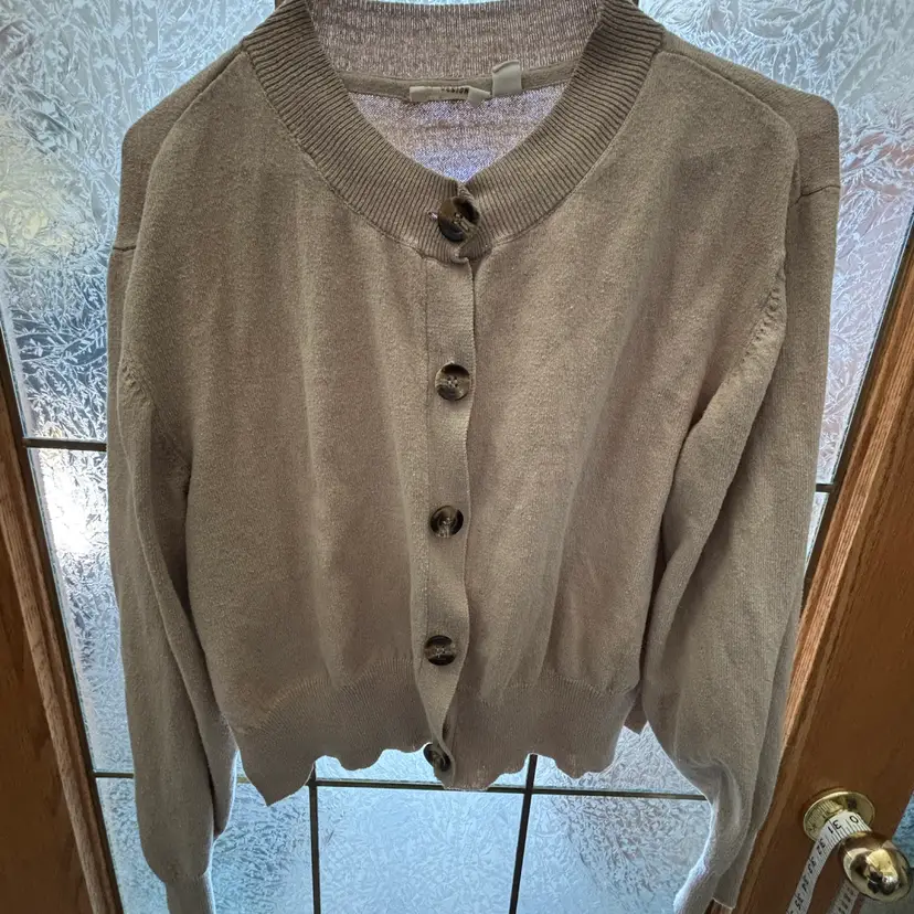 Soft taupe women's cardigan with a classic button-front design. Lightweight knit for everyday layering and comfortable wear. Ribbed neckline and cuffs add subtle structure. Versatile taupe color pairs easily with casual and dress looks. Open slits on each side. 20” pit to pit.