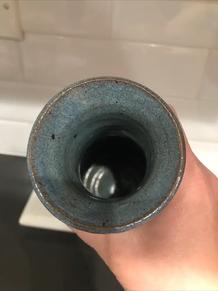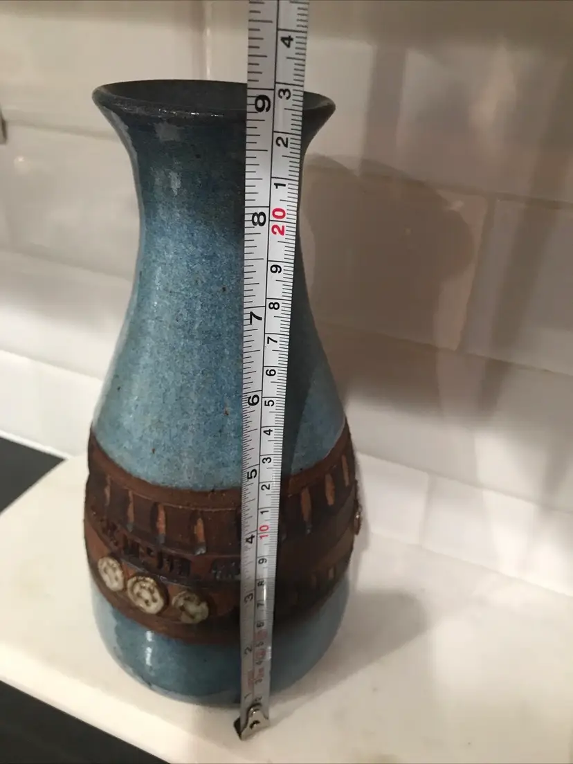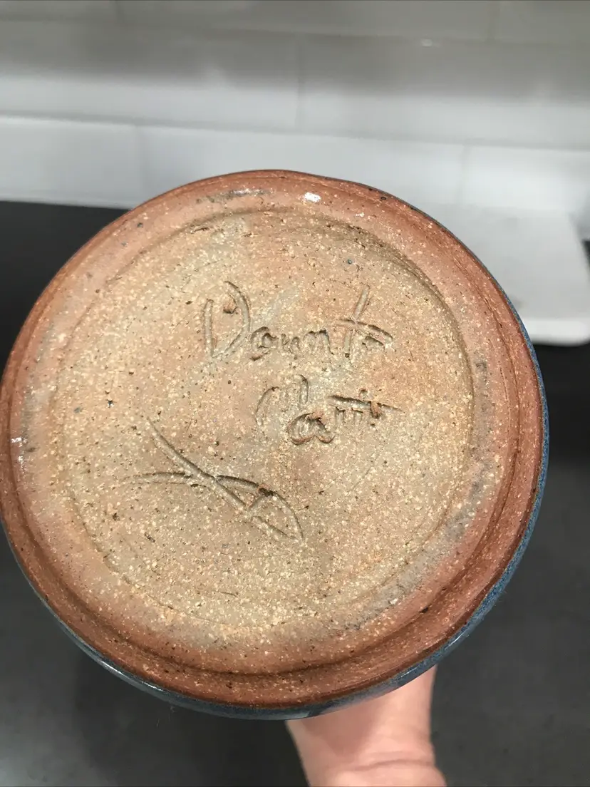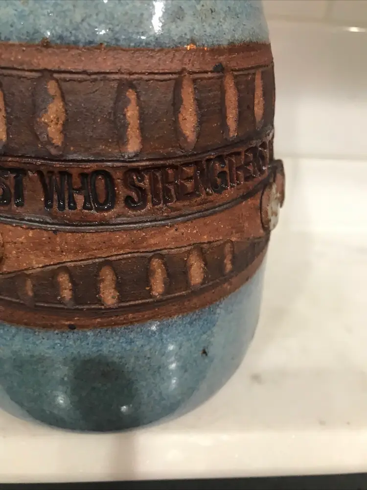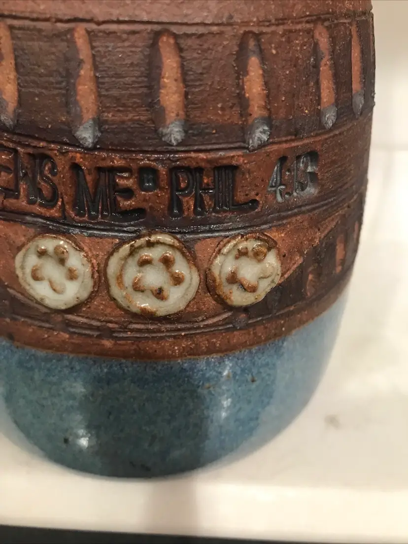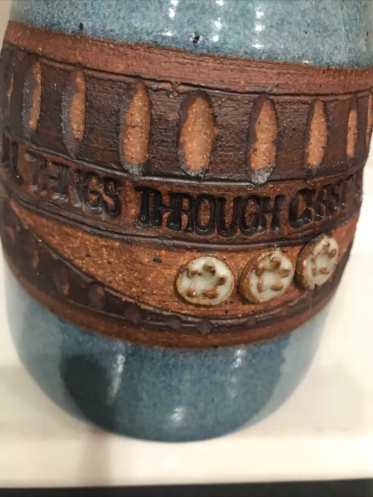Ed schlock pottery vase blue with Phil 4:6 verse engraving