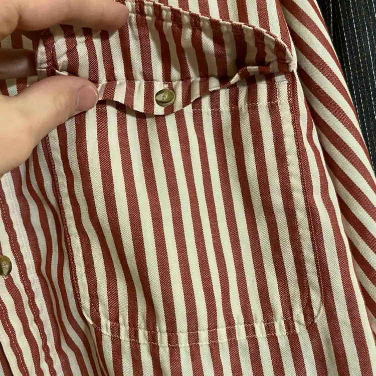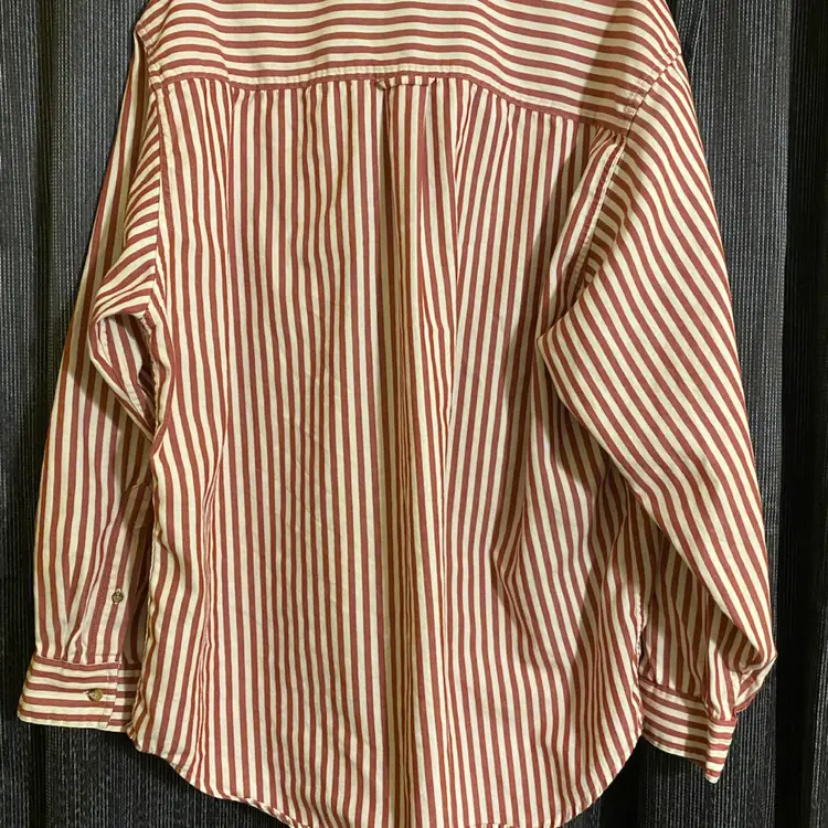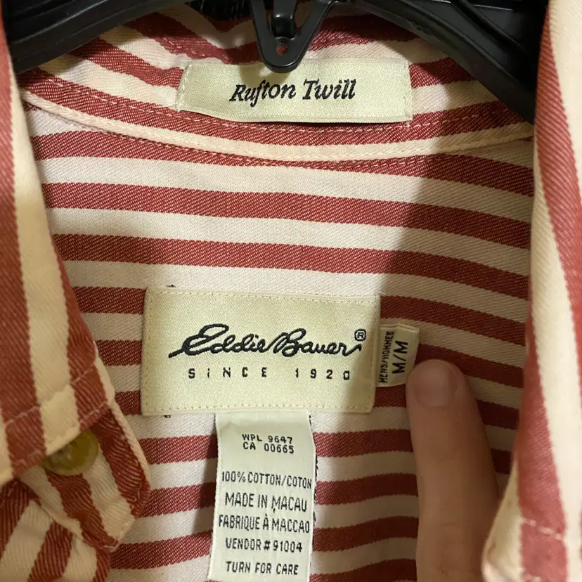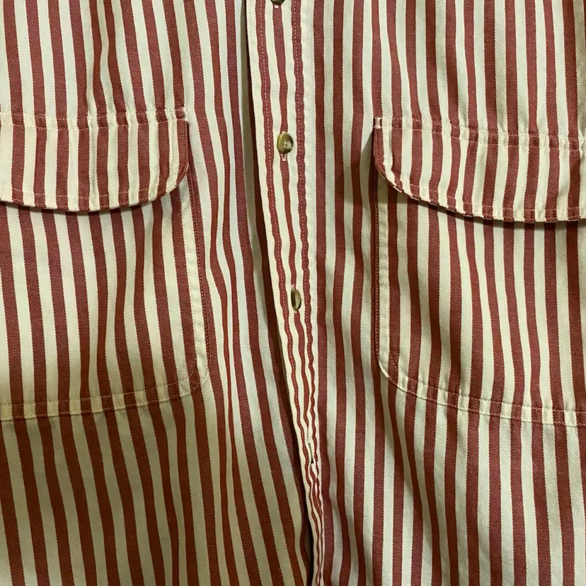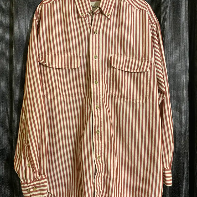 You are purchasing one Men's Size Medium Red & White Striped Vintage Rufton Twill Long Sleeve Button-Up Shirt by Eddie Bauer. Measurements: 26.5" chest, 30.5" length. This Shirt is in overall great condition. The white may not be as crisp as it once was, but there are no rips, holes or stains.