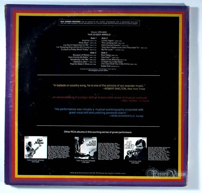 This is, by Eddy Arnold, reached No. 25 on Top Country Albums. It is a compilation album that contains hits such as Anytime, Misty Blue, I'm Throwing Rice (At The Girl I Love), and Bouquet Of Roses among others.