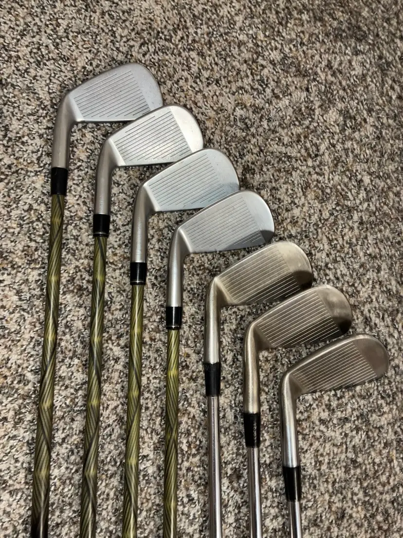 This is going to be a semi long winded as this might need some explanation to some people. This is a combo set of 7 irons PW- 4 iron with P-8 being the Taylormade Tour Preferred Muscle Back blades that are tour issue and have the stamping on hosels. They have S300 Stiff shafts and standard length gapping down the iron lofts. 7-4 iron are the Edel SLS-01 (Same length set) as the shafts are all the same length and are optimally weighted and fitted throughout the lower irons. They have the upgraded Kinetix Same Length Stiff into Regular as they gap down. The benefit of this style of combo set is that you maintain the control you would with the taylormade blades as they get smaller down to the pitching wedge, while also not having an increase in longer iron length while maintaining the same distance and ball flight due to the precision balance in the specs of the set is built with. I drew the red line above an image to illustrate the way the set changes in length until the 7 iron. The taylormade irons definitely have some age but still perform well with grooves and soles all in good shape. Edel forged irons are in much better condition and overall have minimal wear everywhere. This is a pretty odd set that won’t come up again and would highly recommend you give these a try. If you need anymore information feel free to message me.