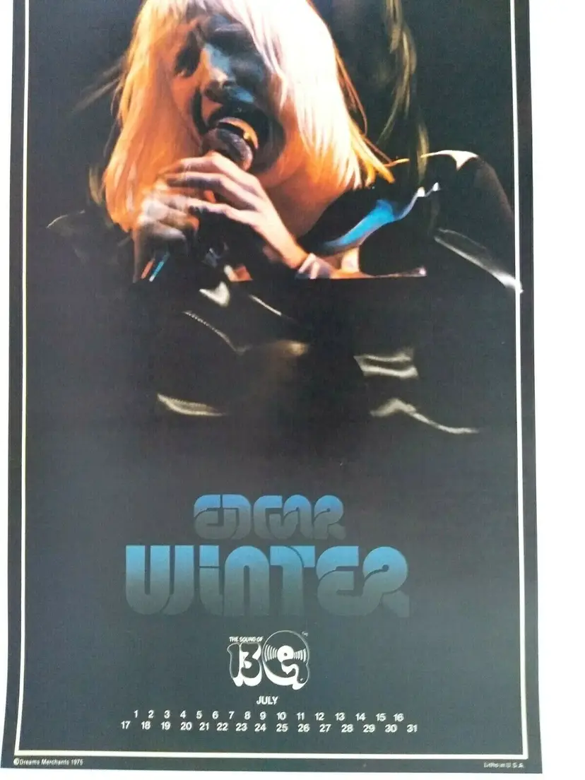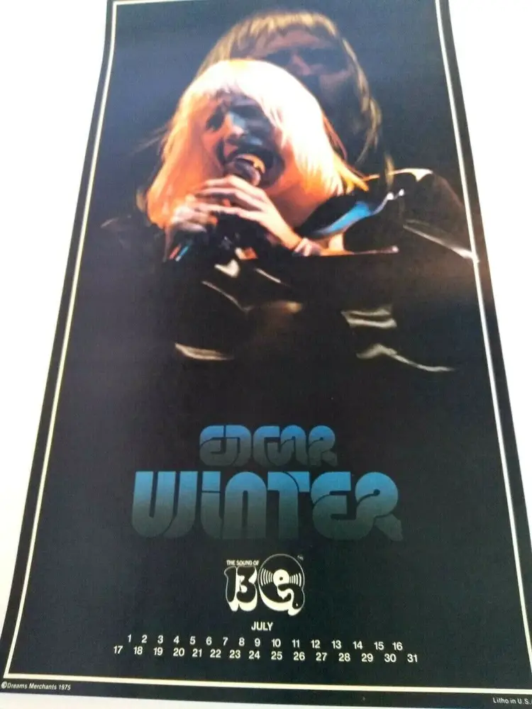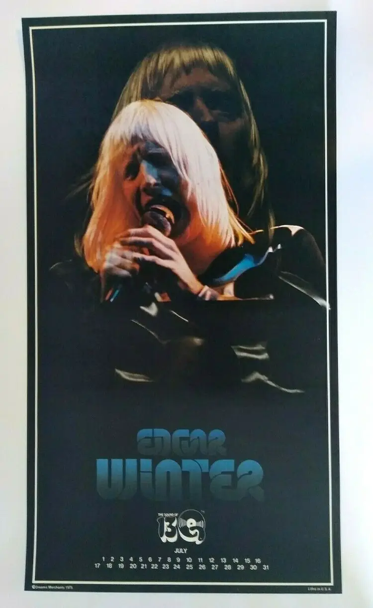 Vintage 22" tall licensed poster for Edgar Winter. These were the first glossy licensed paper posters ever produced featuring rock stars. Dream Merchants issued a different one each month for a year. Now, they are nearly impossible to find. The Edgar Winter poster was issued in 1975. Has light age wear.