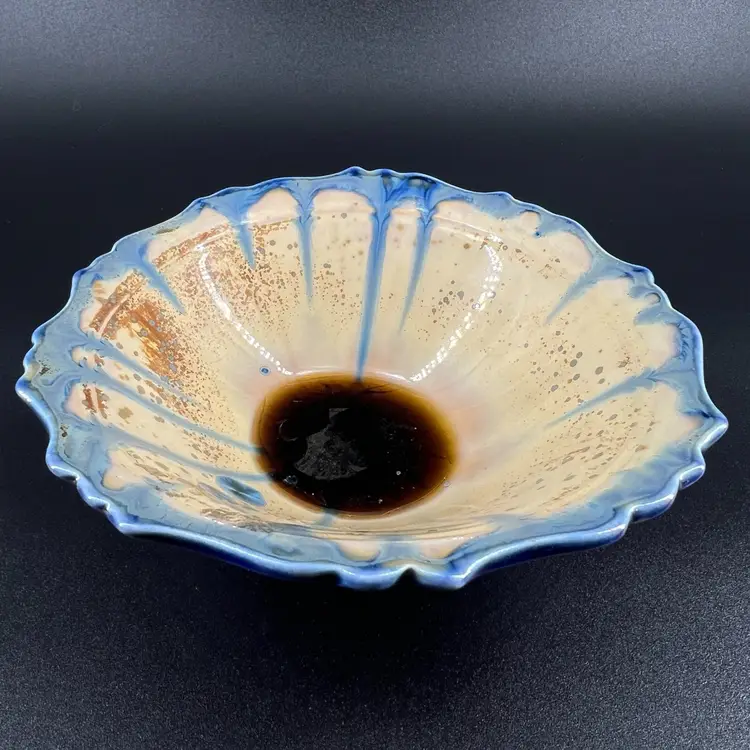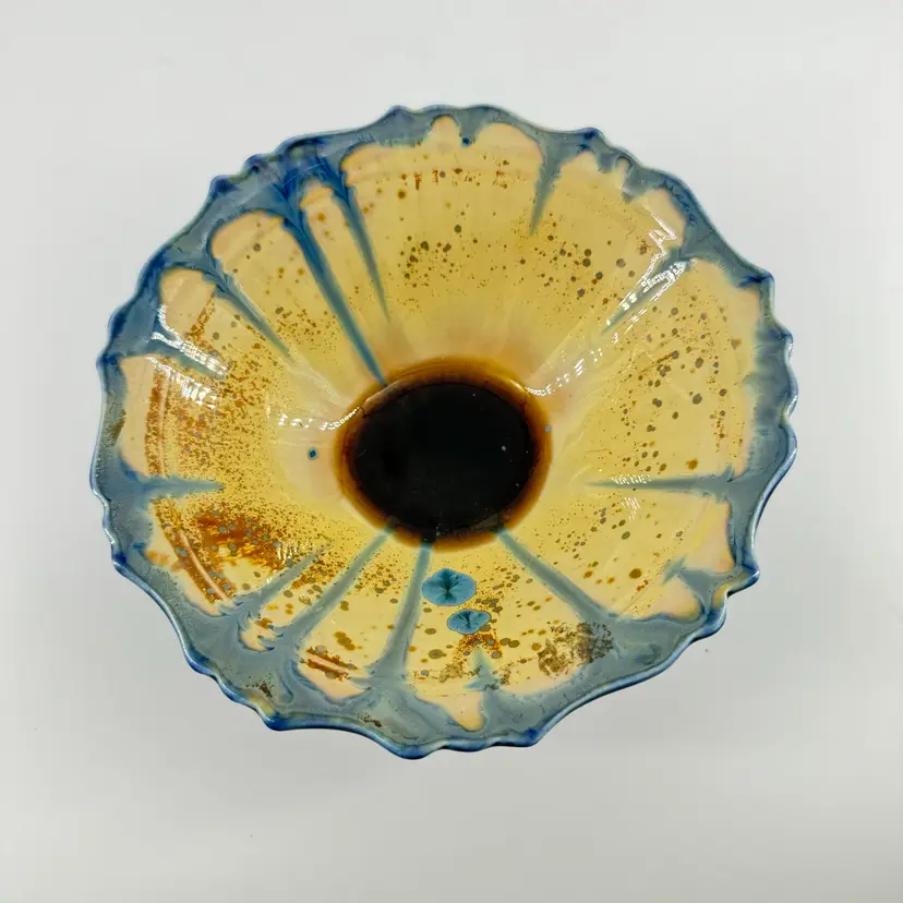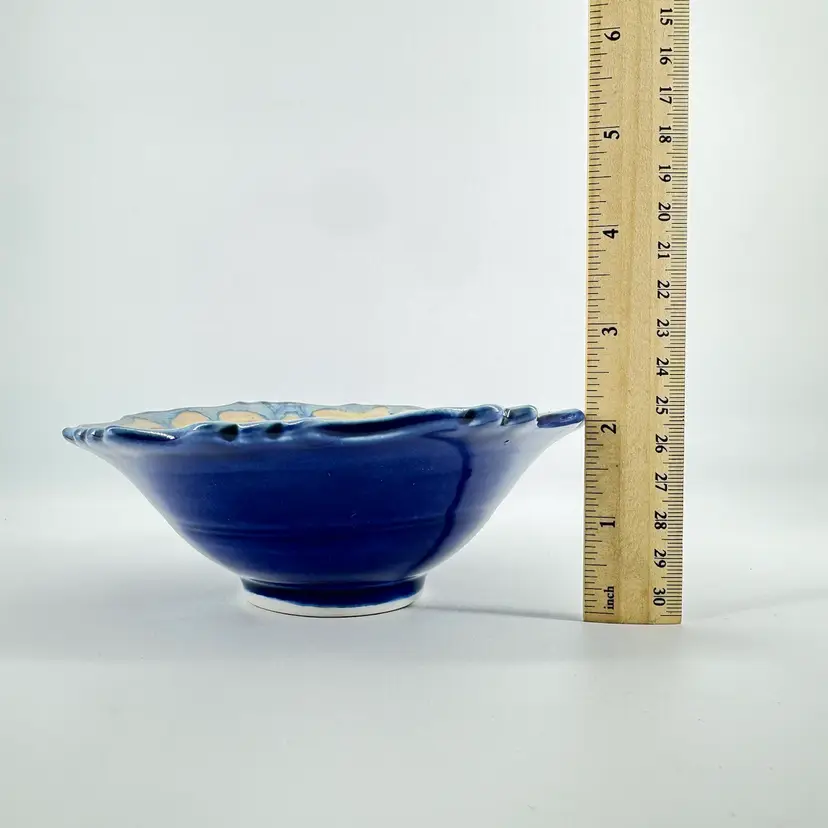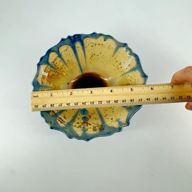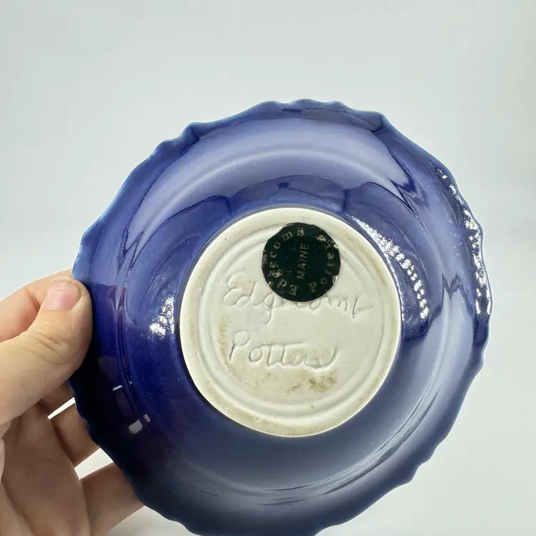 Height approximately 2” Width approximately 5” 1/2” This edgecomb bowl has a crystalline glaze. There are no chips or cracks. Is signed on the bottom.
