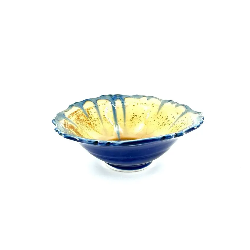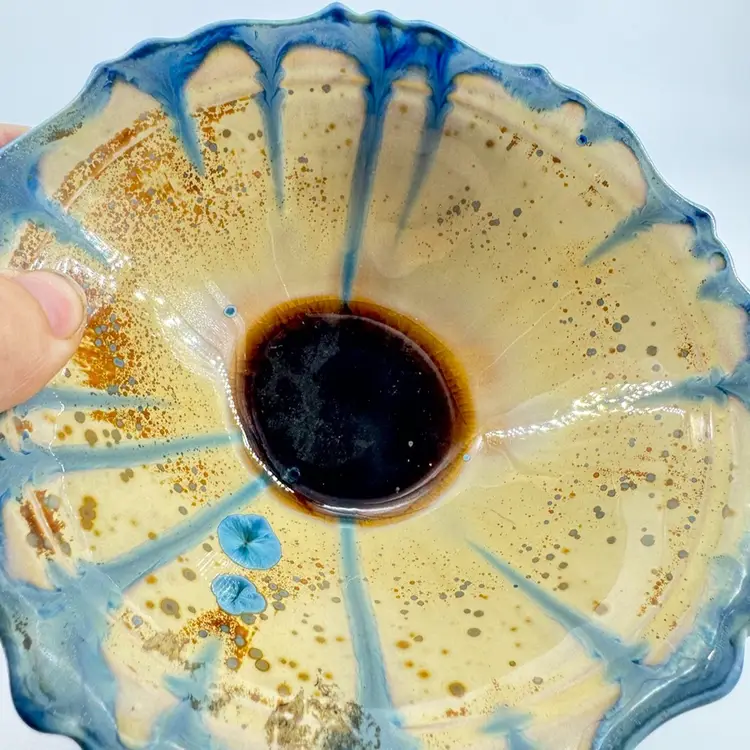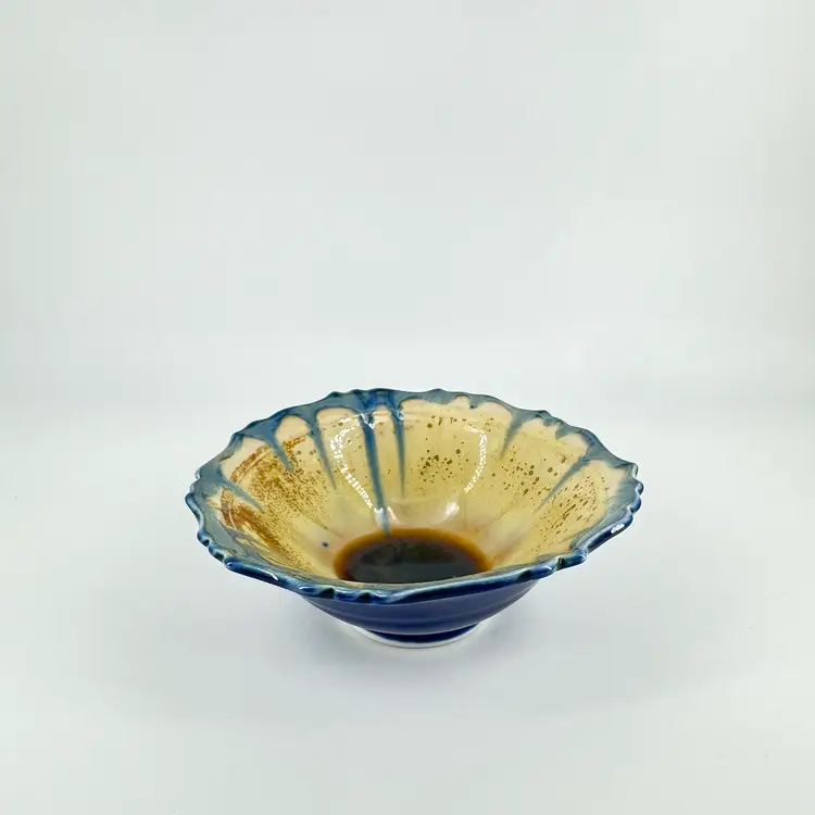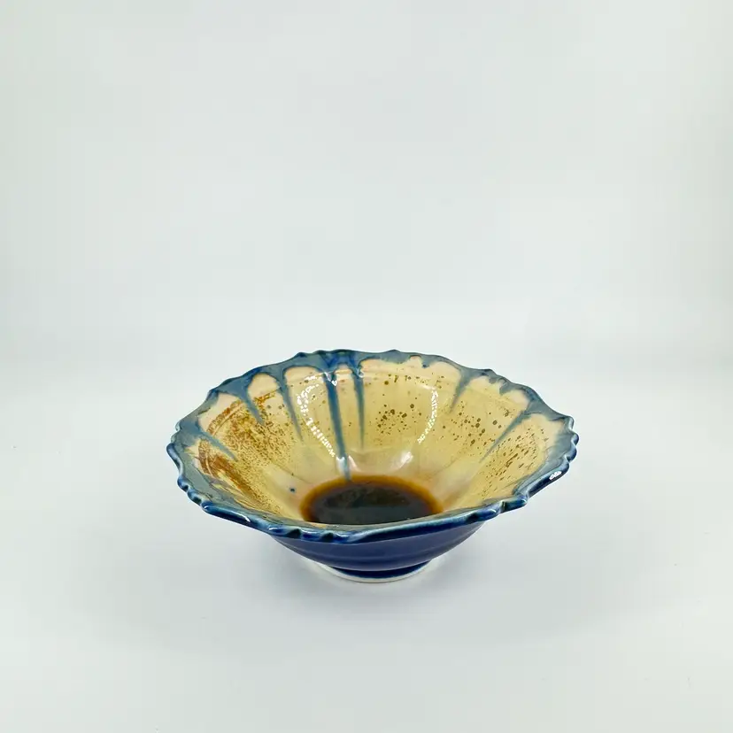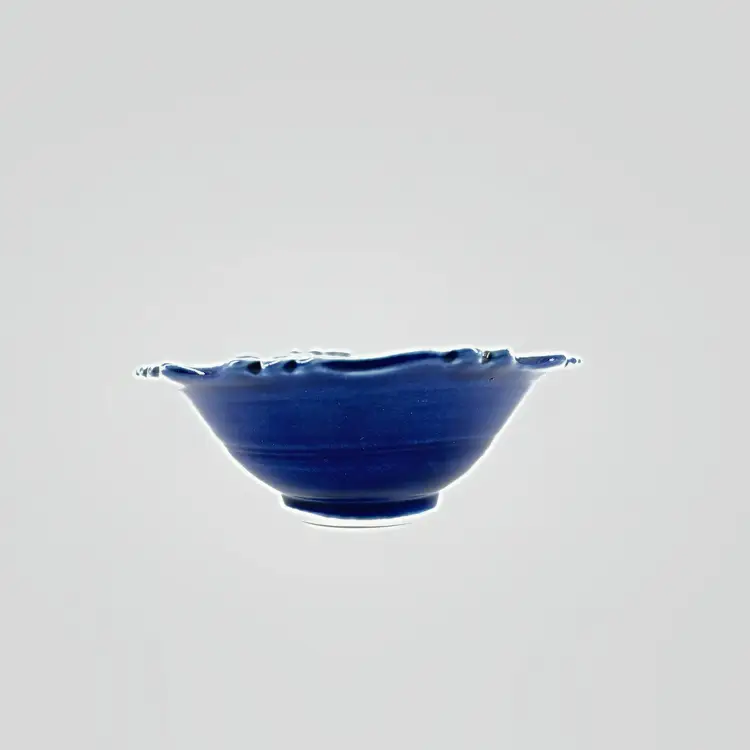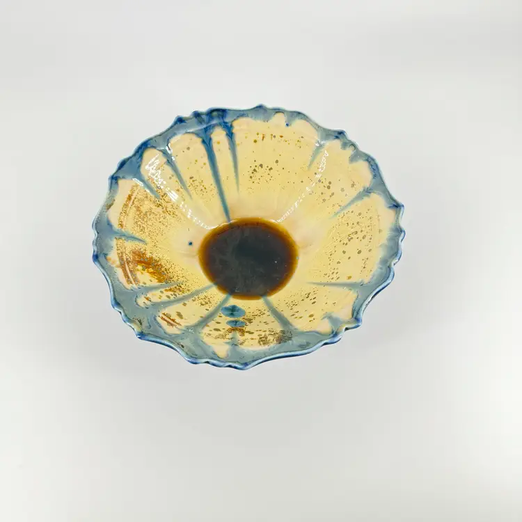 Height approximately 2” Width approximately 5” 1/2” This edgecomb bowl has a crystalline glaze. There are no chips or cracks. Is signed on the bottom.