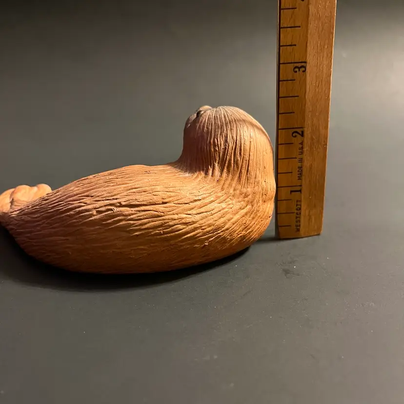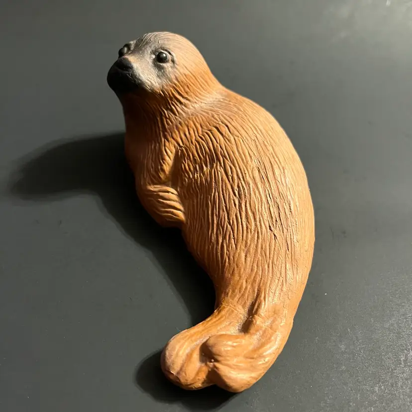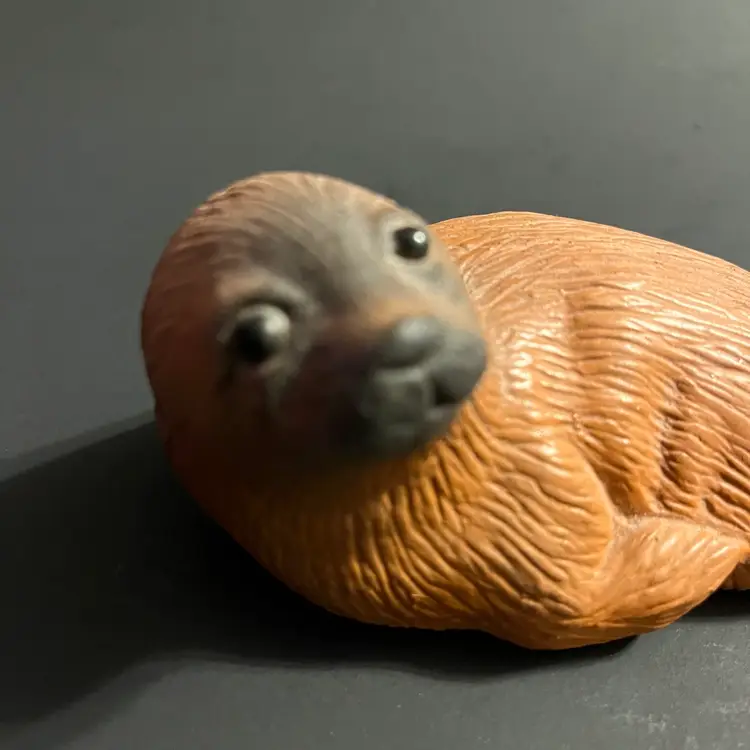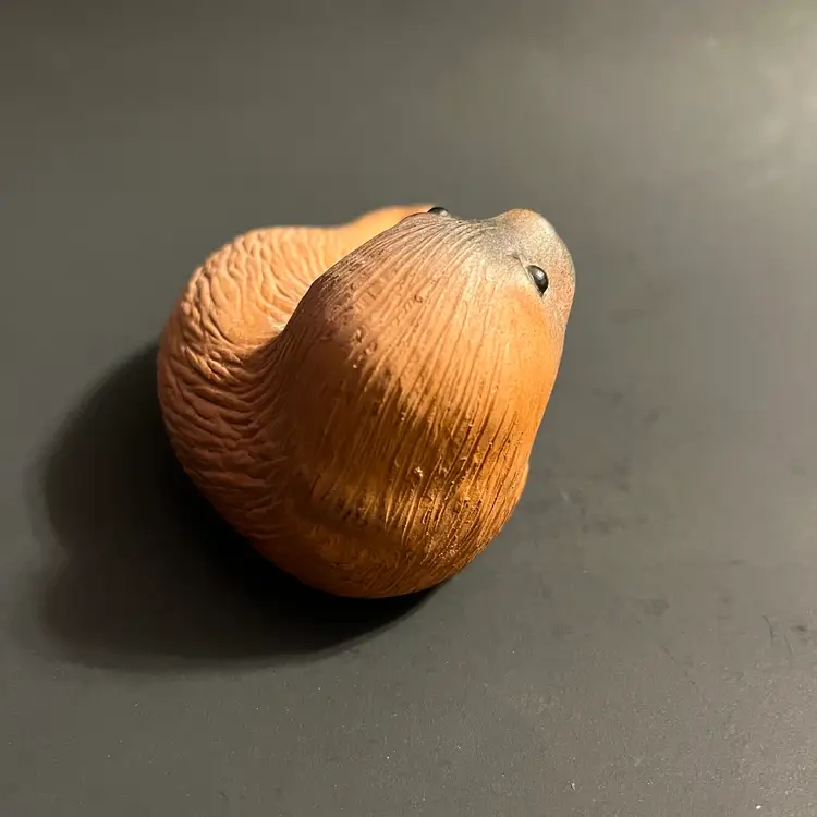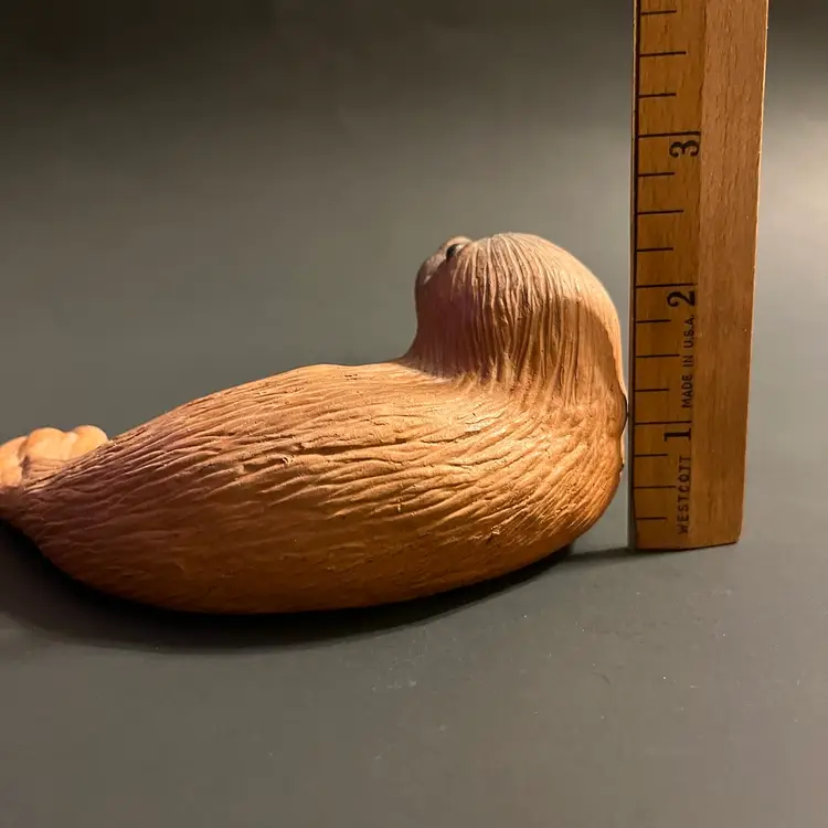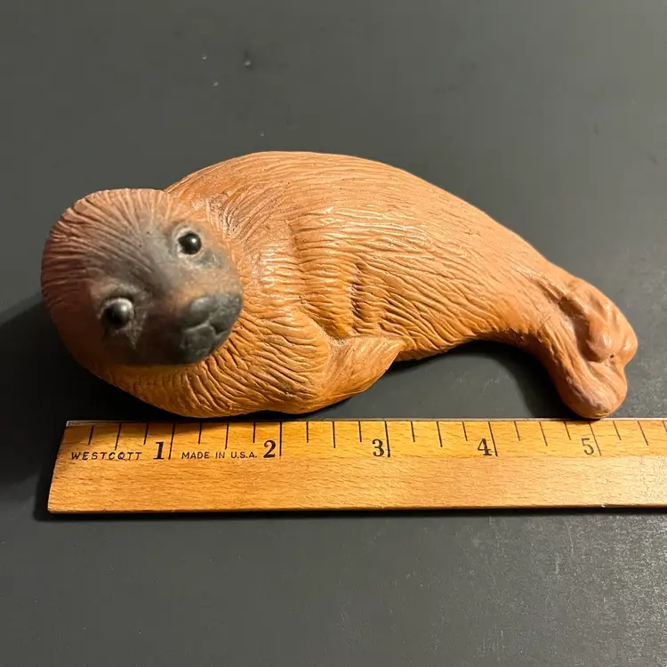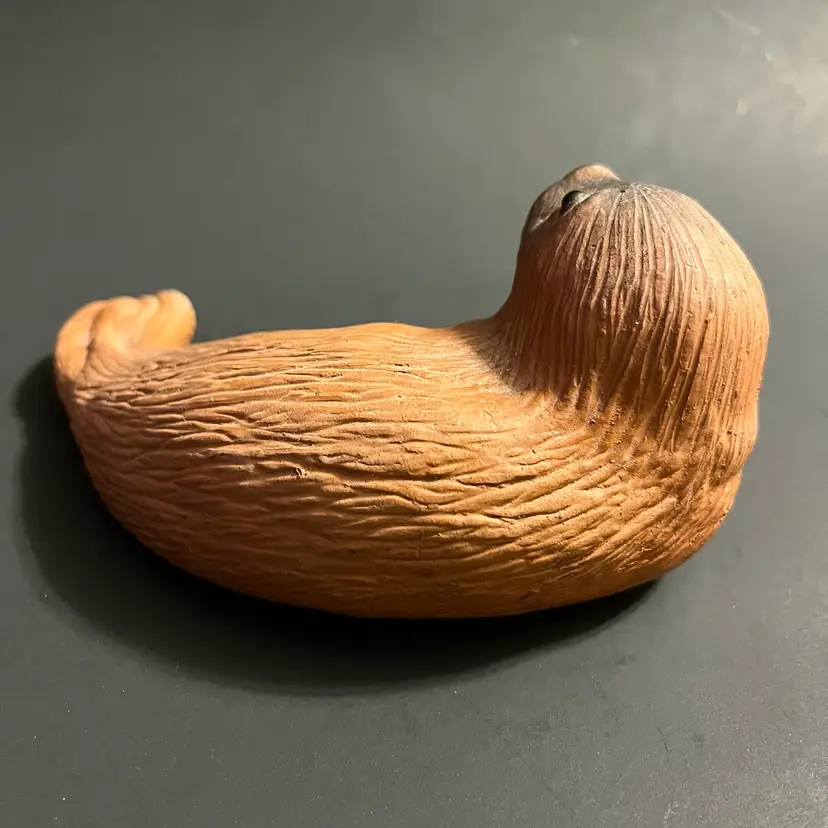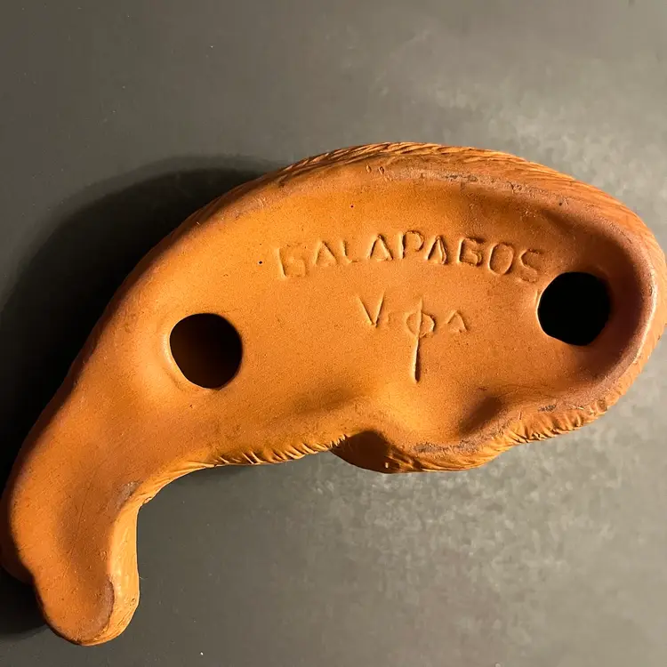 This vintage Eduardo Vega terracotta seal figurine, measuring approximately 5.5 inches in length, is a striking example of Galápagos pottery from Ecuador. Handcrafted in red clay, the piece captures the gentle form of a resting seal, rendered with Vega’s characteristic balance of simplicity and expressive detail. Known for his celebrated depictions of Galápagos wildlife, Eduardo Vega’s work combines regional artistry with naturalistic charm, making his sculptures highly sought after by collectors of Latin American studio pottery. The warm terracotta surface shows subtle variations in tone, enhancing the handmade quality and rustic appeal. Signed and authentic, this figurine reflects Vega’s dedication to preserving the spirit of the islands through ceramic art. Condition is excellent, with no chips or cracks, and the piece displays beautifully as part of a collection or as a standalone accent.